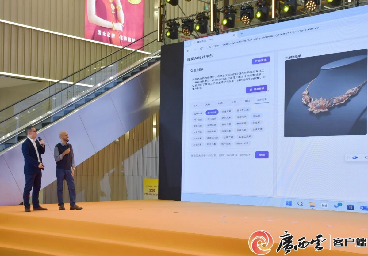 活动现场。平桂区新兴产业发展中心供图 现场高光60秒 AI定制速度引爆全场 活动现场,平台实时演示成为全场核心焦点——来自东盟的客商下达定制需求,AI大模型20秒内生成2款精准设计图,同步联动园区“超级工厂”端,全程从创意提出到生产建模启动,仅用时不到60秒。颠覆性演示引爆全场,中外客商争相体验互动,生动诠释了AI技术如何彻底革新传统珠宝设计定制的冗长流程。