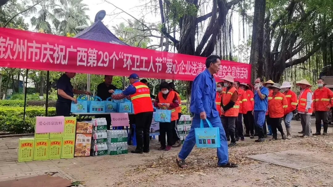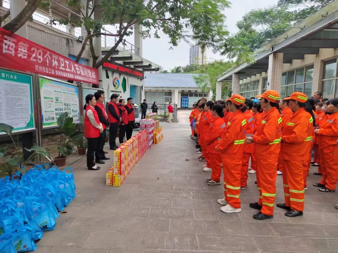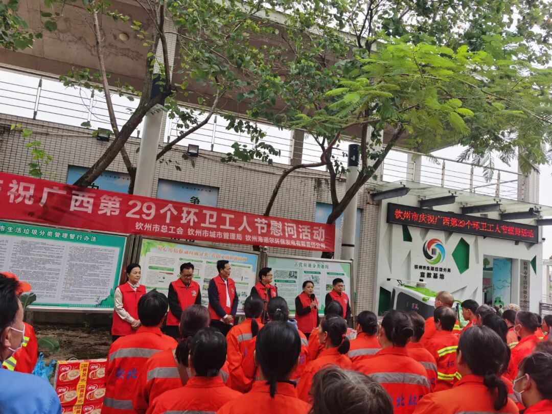 金秋送温暖,慰问显关怀 10月23日下午,市城市管理局联合市总工会、钦州海诺尔公司,在钦州市生活垃圾分类宣教基地(白石湖喷泉舞台旁)隆重开展环卫工人节慰问活动。市城市管理局、市总工会、市环卫处、钦州海诺尔公司有关领导,中马产业园区及钦南区、钦北区100多名环卫工人代表共同参加活动。有关领导先后发言,分别从行业管理、工会关怀、企业协作等角度,表达了对环卫工人的深切关爱,并表示将持续加大支持力度,改善环卫工人的工作生活条件,并为参加活动环卫工人代表送去米、油、清凉饮品等慰问品,将节日的祝福和温暖精准传递到环卫工人心中。