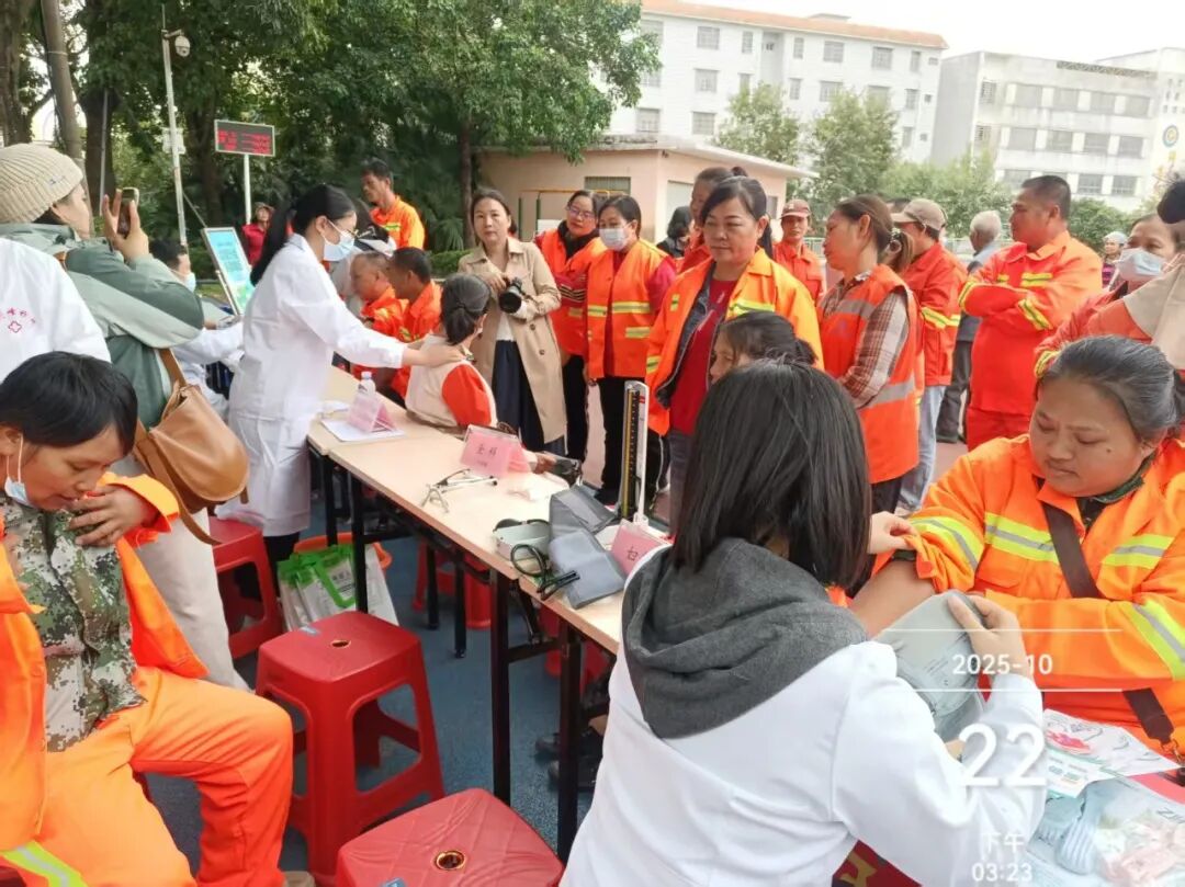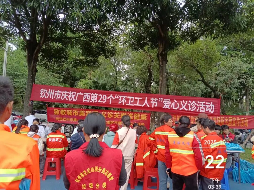 关爱不停歇,健康伴身旁 10月22日下午,市城市管理局联合民进钦南区支部、市第一人民医院及钦南区人民医院,在中山公园体育场为一线环卫工人送上爱心健康义诊服务。针对环卫工人肩颈腰腿劳损多发、户外作业易受天气影响等职业特点,现场专门设置肩颈腰腿疼痛科、预防保健科、全科等诊疗台,为环卫工人们提供免费的基础健康筛查、专科咨询诊疗服务。医护人员还通过健康宣传展板,详细讲解秋冬季常见疾病预防、户外作业防晒防寒技巧、职业病防护及合理膳食等知识,让环卫工人们在家门口就能享受到专业的医疗服务。同时,现场设置的垃圾分类宣传专区热闹起来,工作人员结合环卫工作实际,向环卫工人细致讲解生活垃圾分类标准、不同场景分类技巧及相关政策要求,并赠送定制的分类垃圾桶、宣传手册等物料,助力他们在一线作业中更好地引导市民参与垃圾分类。拿到宣传物料的环卫工人代表笑容满面,纷纷表示既感受到了温暖,又学到了实用知识,今后会以更饱满的热情投入工作,既做好保洁工作,又当好垃圾分类宣传员。
