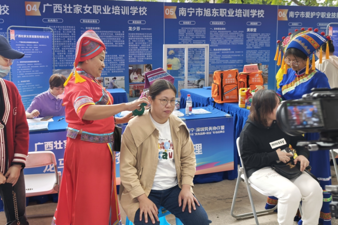 图为零工市场招聘会现场及口袋公园创业文化展示。 树品牌:“壮家女家政” 作为南宁本土亮眼的劳务品牌,“壮家女家政” 以 “专业技能 + 暖心服务” 破圈。通过标准化培训、规范化管理,把普通劳动者培育成持证上岗的家政能手,从日常保洁到专业护理,用口碑赢得市场信任,既擦亮了 “壮家女” 的品牌名片,也让更多人靠技能端稳 “饭碗”。 这是招聘会现场上“壮家女家政”劳务品牌培训人员进行保健按摩培训展示。