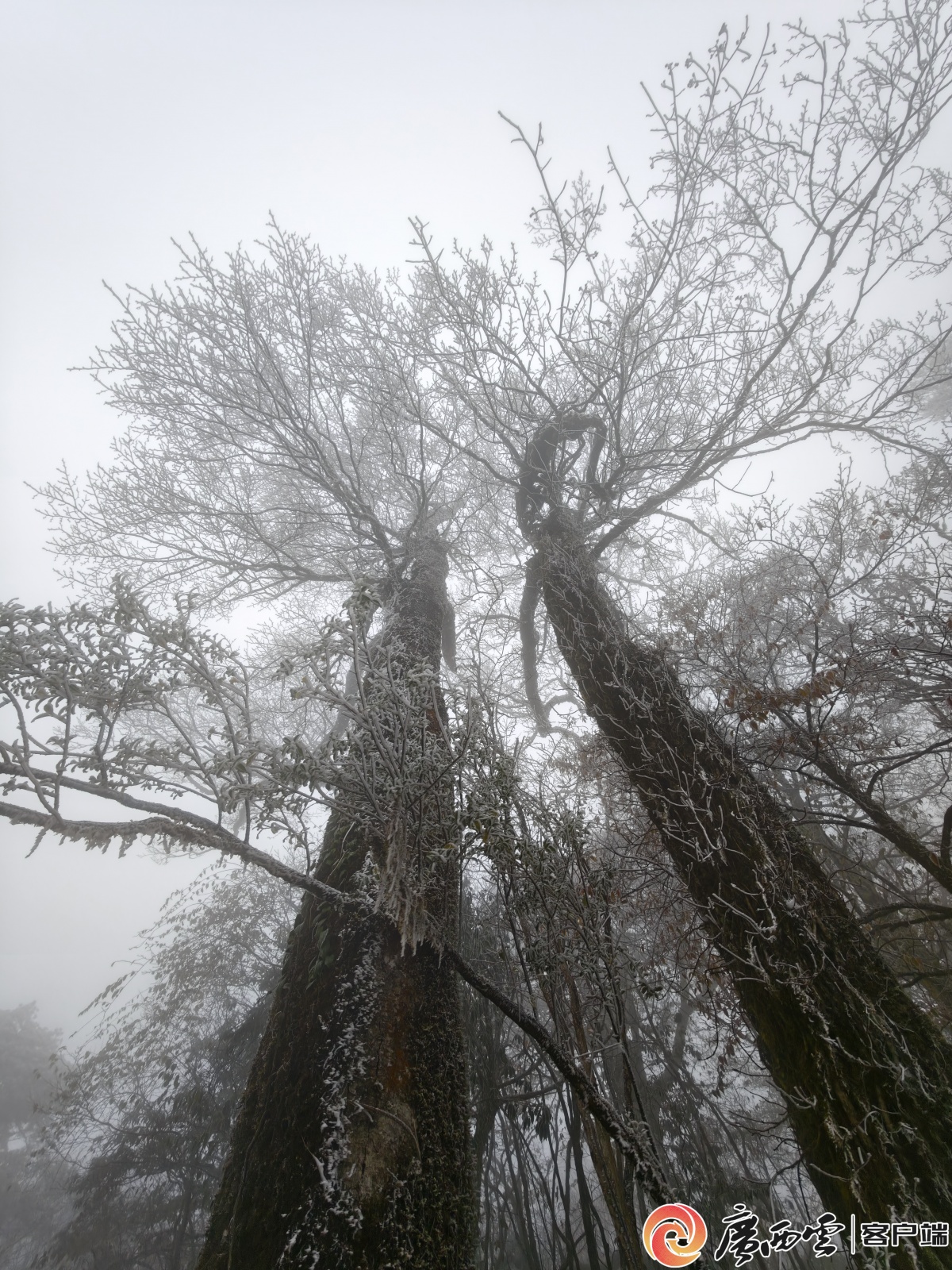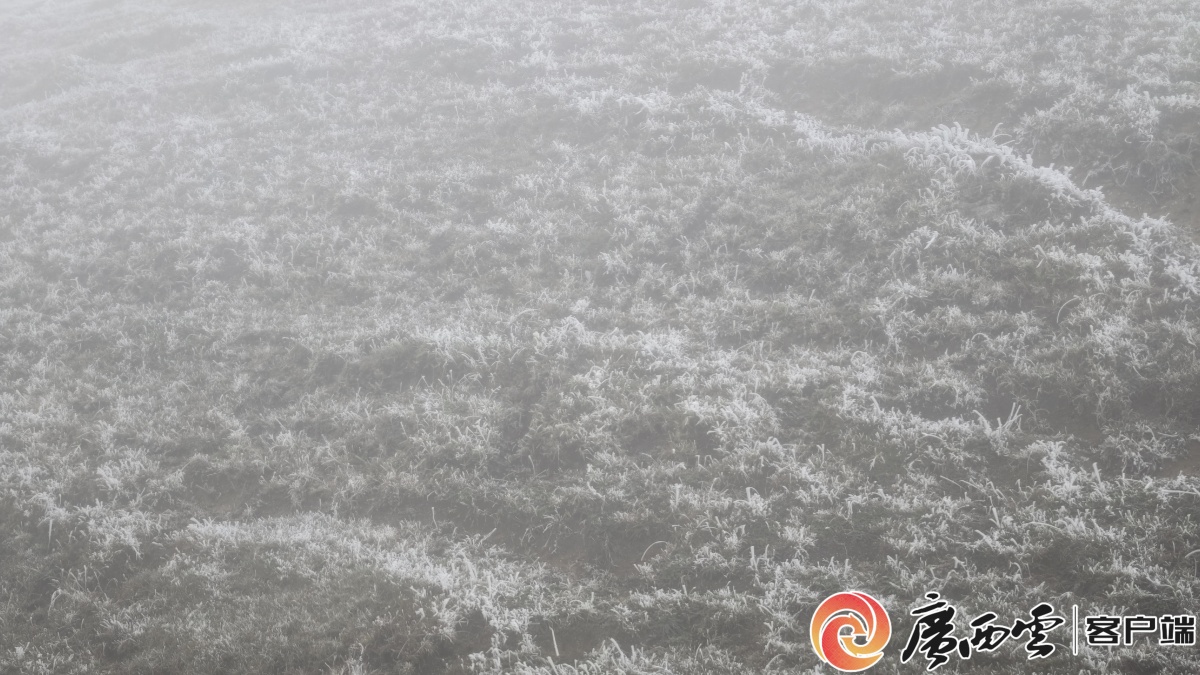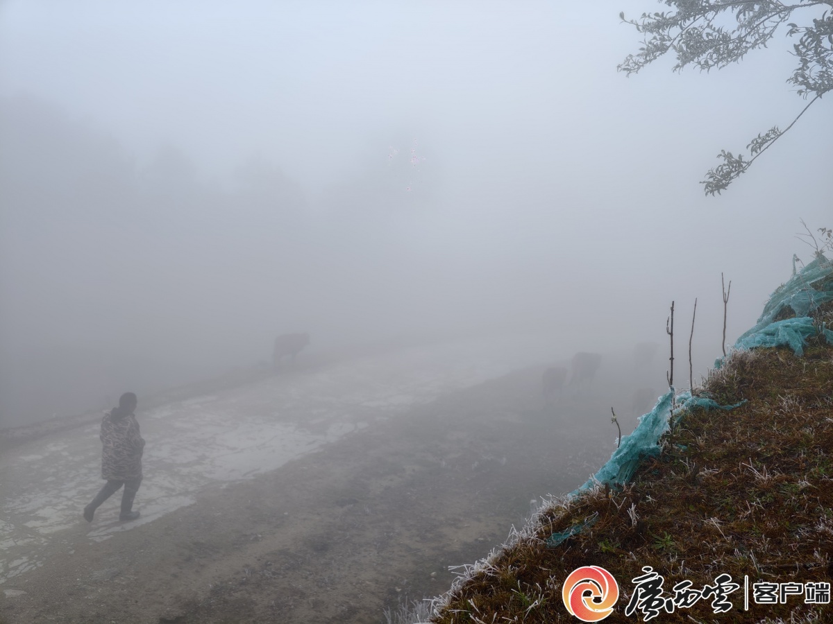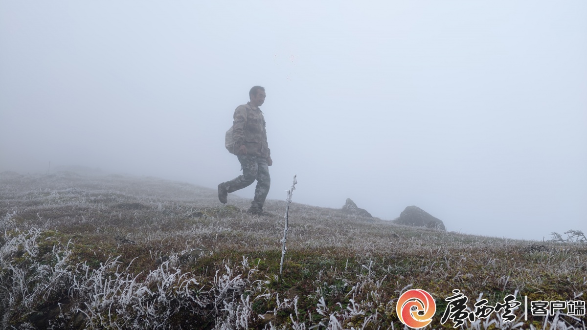 摩天岭上出现雾凇现象,草甸被冰雪覆盖。梁强 摄 摩天岭位于广西柳州市融水苗族自治县西北部杆洞乡尧告村,是九万大山山脉的主峰,海拔1938米。该山脉由上元古代雪峰期花岗岩构成断块山地貌,表层分布着灌丛草甸土。 11月18日7时,摩天岭上温度已骤降至零下,出现雾凇现象,山顶植被和树木裹上银装。数位牧民从尧告村步行一小时登顶,召唤散养在山顶草甸的牛群聚拢回家。 今天(18日)7时,全区大部气温1字开头。其中桂北部分地区气温10℃以下。今天6时,中央气象台发布寒潮、大风双预警,广西广东等地部分地区降温幅度可达10℃。 11月18日早上,柳州市气象台发布最低气温、极大风统计及最新天气预报,11月17日7时至18日7时(24小时)受高空槽东移引导地面强冷空气南下影响,柳州市大部地区阴天有小雨,部分地区有6~7级、局地8级阵风。