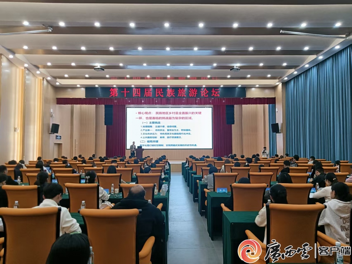 活动现场。 论坛以专家主题报告、分论坛会议、圆桌论坛等形式展开深入交流和研讨。广州大学张河清教授、云南民族大学何少英教授、中南民族大学李忠斌教授、云南大学吕宛青教授、中央民族大学彭建教授等专家学者,分别作《数字化赋能民族地区乡村全面振兴的理论思考与路径选择》《旅游开发进程中泸沽湖畔栖村的传统村落保护与民族文化传承》《文旅融合促进西南民族村寨保护发展的若干思考》《农文旅融合背景下新型经营主体的角色重构与价值实现》《知行合一:旅游促进中华民族共同体建设的实践路径与研究议题》等主旨报告,共同就民族旅游的现状、问题、机遇与挑战进行深入交流与分析,为参会的各位青年学者提供了最新的研究指导。 分论坛环节,140余名参会者(含广西区内外高校学者、研究生及贺州学院师生)围绕“民族旅游资源开发”“乡村旅游品牌建设”等议题深入交流。针对贺州“多民族聚居、生态资源富集”的特点,专家建议可依托瑶族盘王节、客家山歌等文化资源,打造沉浸式文旅产品,推动“生态观光”向“文化体验”升级,相关观点获与会者广泛认同。 据悉,论坛由中国人类学民族学研究会民族旅游专业委员会、中国旅游研究院民族旅游研究基地主办,贺州学院旅游与体育健康学院联合贺州市文广旅局、住建局、民宗委、旅游协会承办。 |