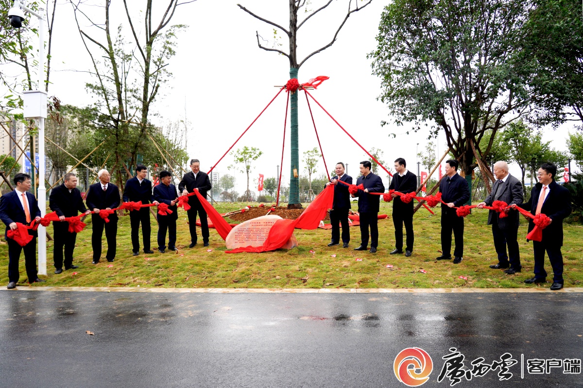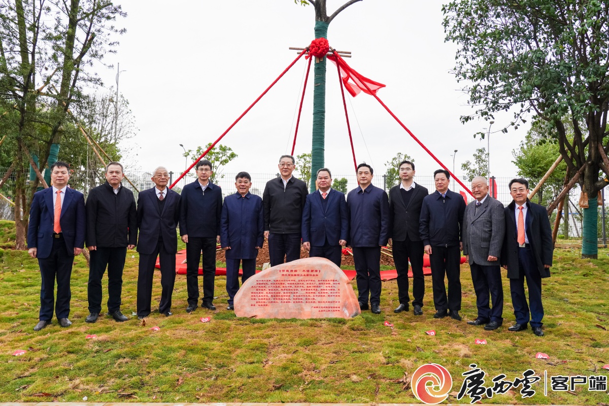 仪式现场,与会领导和嘉宾为柳工传承林石碑揭幕,并挥锹铲土同培万寿果树。唐绍怡 摄