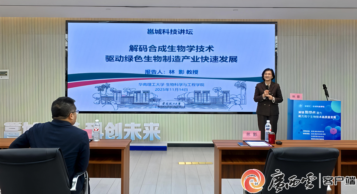11月14日上午,由南宁市科学技术局主办的第十四期“邕城科技讲坛”活动在桂林理工大学南宁产业研究院举行。本次活动以“解锁酶技术潜力,助力南宁生物技术高质量发展”为主题,邀请华南理工大学生物科学与工程学院二级教授林影、广西生物炼制重点实验室主任庞浩进行专题演讲。市直和城区相关部门代表、行业专家学者、企业负责人等代表参会,共探以酶技术和合成生物学为核心的生物制造产业新图景。 “酶技术在降低工业能耗、减少污染、提升产品附加值方面的显著优势。”林影以《解码合成生物学技术驱动绿色生物制造产业快速发展》为题,系统阐述了合成生物学在生物制造产业中的核心作用与发展前景,并分享了其团队关于毕赤酵母底盘细胞基因“读、改、写”研究的技术突破。他进一步结合南宁“聚焦区域特色”“强化创新驱动”“深化对外开放”和“拥抱数智技术”四大特点,为南宁生物制造产业提供发展新思路。