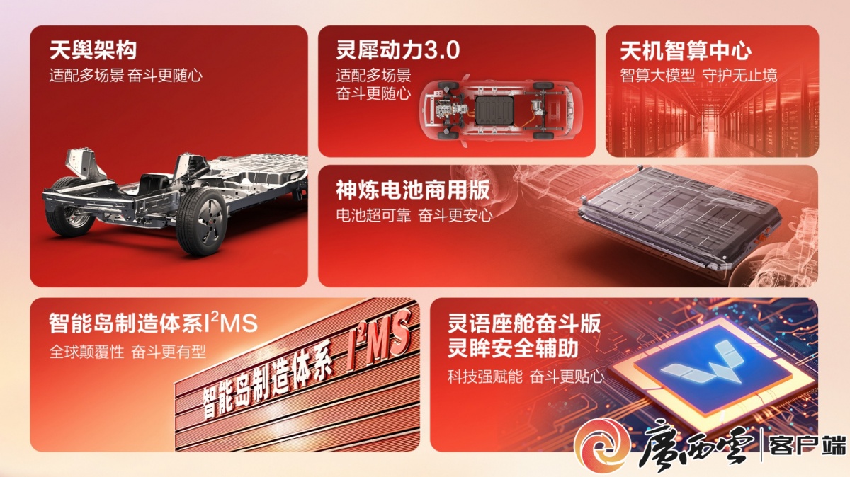 图为上汽通用五菱以6大引领性科技创新赋能用户的多元化创富场景。 技术领域,天舆架构基于两千多万用户创富场景,创新打造积木式车身与模块化底盘,为千行万业定制创富神车;灵犀动力3.0首创商用车多能源驱动架构,实现动力更强、跑得省、跑得远;神炼电池商用版延续300万新能源碰撞“零自燃”安全基因,带来“多快好省”的体验;灵语座舱与灵眸辅助驾驶提供乘用车级智能体验,集成限高限重提醒、行业内首个适配CDR中国数字调频应急广播等功能,搭配AEB自动紧急制动、车道保持、疲劳监测、全景影像等安全配置,多拉快跑更安全。