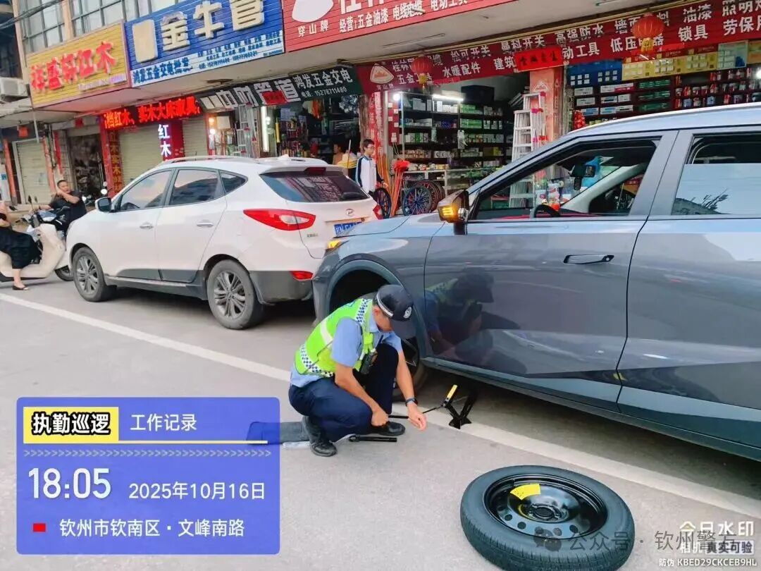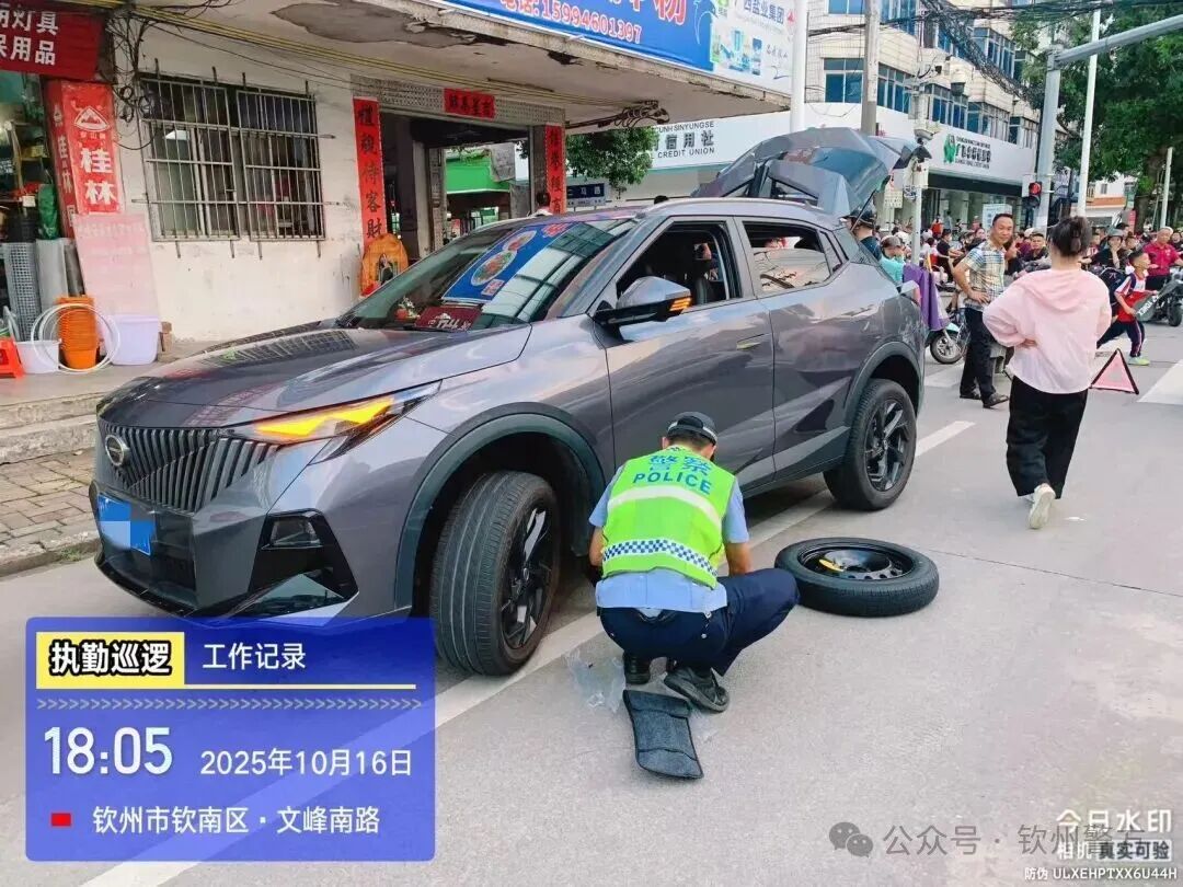 “谢谢你们!辛苦你们。”家属紧握龙拔辉的手再三致谢,二人与家属道别后,便匆匆返回岗位,继续投入晚高峰交通疏导工作。 10分钟紧急换胎,护学岗秒变“救援岗” 10月16日18时许,钦州市第四小学护学岗晚高峰期间,文峰南路车流人流交织,辅警陈超新正疏导交通、保障学生与群众出行安全。 此时,一名车主焦急求助,称其私家车在学校附近左前轮突发爆胎,自己不会换胎,车辆临时停放已造成后方拥堵,存在安全隐患。了解情况后,陈超新先在车后设置警示标识,再从警车后备箱取出千斤顶、扳手等工具,俯身车底开展换胎作业。拆卸破损轮胎、固定备用轮胎、拧紧螺丝,一系列动作娴熟流畅,10分钟后便更换好备用胎,车辆恢复正常行驶。