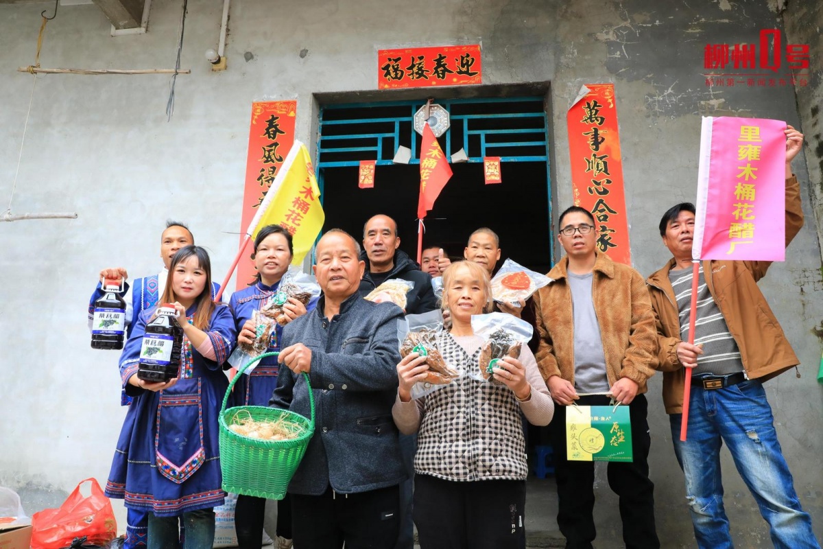 韦山的父母亲(前排居中)和亲朋好友在展示慰问韦山的里雍土特产和美食。