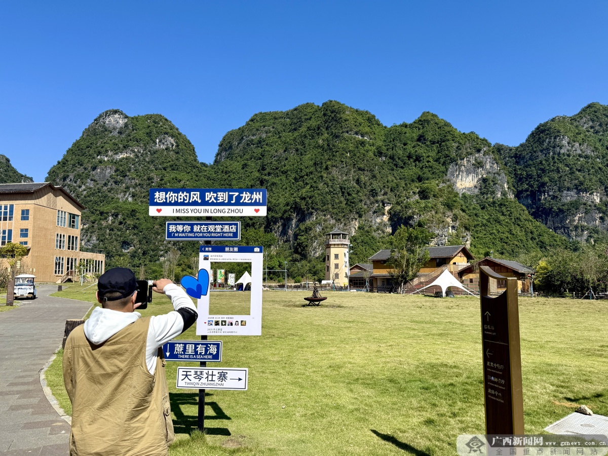 天琴壮寨景区内,采访团成员正在打卡拍照。记者 李慧子 摄 龙州县文化旅游和体育广电局局长谢文博表示,今年前三季度,该县共接待国内游客763.34万人次,同比增长11.05%。未来,龙州将持续依托红色文化根基,深挖自然资源禀赋,打造更多高品质生态观光景点。 离开天琴壮寨,采访团继续前行,一路峰林叠翠、溪涧潺潺。抵达大新县中越德天(板约)瀑布跨境旅游合作区时,恰逢晴日当空,阳光洒在瀑布上,水花飞溅间水雾弥漫,站在观景台上便能感受到清凉湿润的水汽。清澈的归春河蜿蜒其间,将中国与越南的山水连为一体,竹筏穿行在河面上,恍若行舟画中。