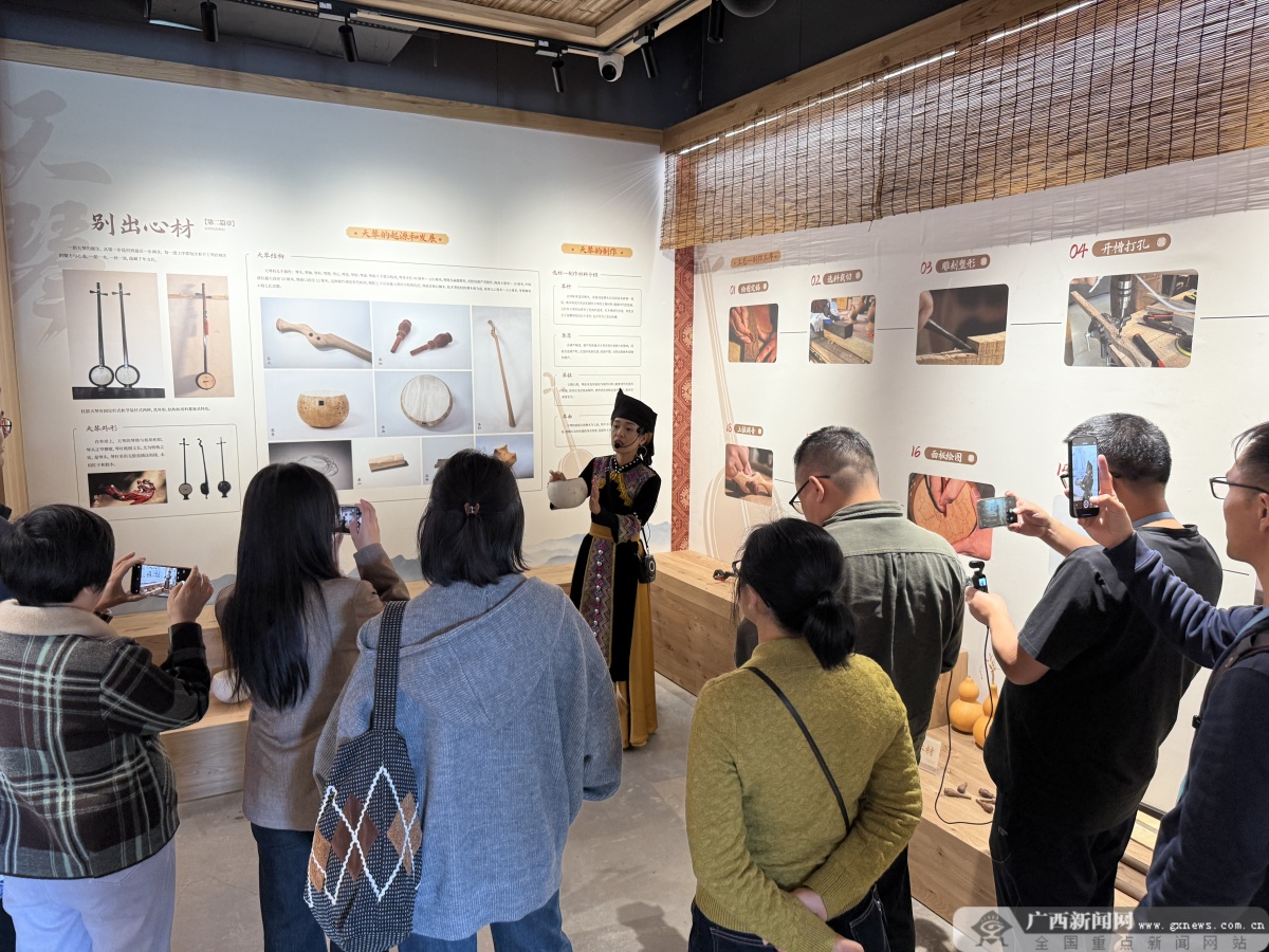 讲解员正在介绍天琴的历史与制作工艺。记者 李慧子 摄 天琴文化馆里陈列着各式天琴,讲解员细致地介绍着天琴的历史与制作工艺,龙州壮族天琴艺术第十一代传承人朱仲衡弹奏着古朴空灵的曲调,让大家沉醉其中;在壮锦文化馆内,一名织娘端坐织机前,彩线在经纬间穿梭跳跃,木梭起落间,指尖流转的非遗技艺令人叹服;1∶1复原的壮寨木楼也让大家感受到壮族建筑的精巧。 “这是我第一次来龙州,满目青山绿水,空气里都是草木的清香,在这里生活的人一定幸福感满满。”广西大学新闻与传播学院硕士研究生伊丹阳望着远处层叠的峰峦感慨道。广西龙州红文化旅游有限公司天琴壮寨负责人韦海锋介绍:“我们注重情绪体验的挖掘,用优美的山水风光、新鲜的本地食材、独特的非遗体验吸引游客。除了国内游客,还有不少东盟国家的游客也专程前来游玩。”