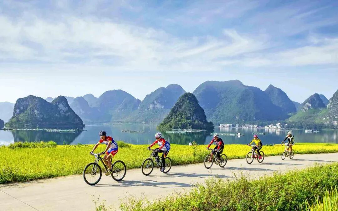 湖畔骑行。邱加西 摄 山水有约,风情靖西。有时间的话,不妨走进这座边关小城:踩过旧州古镇的青石板,泛舟鹅泉的碧波之上,探寻峡谷的地质奇观,聆听末伦调的悠扬婉转,在自然与人文的交融中,留下一段难忘的假日记忆。(何艳玲) |