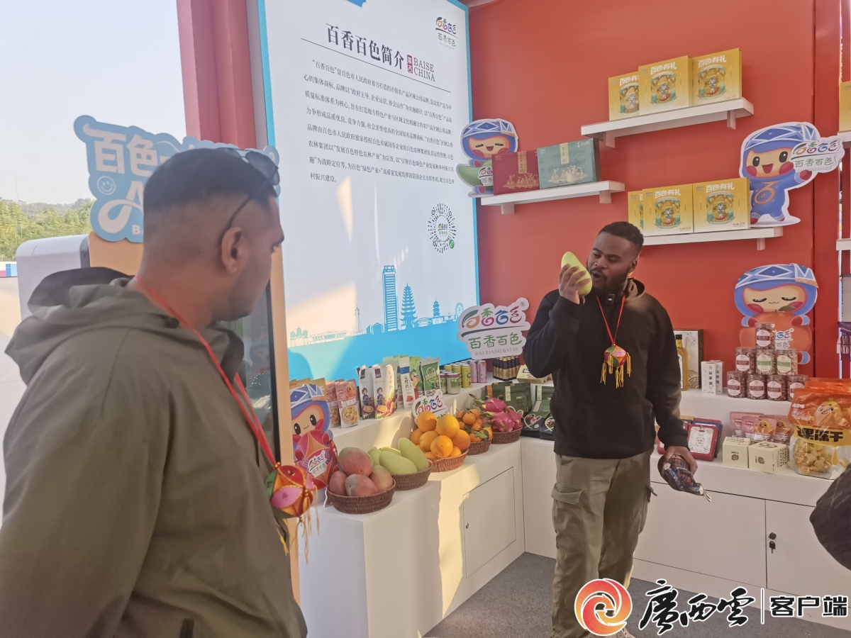 外国游客在百色展区购买“百香百色”区域公用品牌产品。记者 凌聪 摄 精彩纷呈,好物云集。在南宁、柳州展区,“青秀山”等一批融入地标元素的文创产品成为解读“老友南宁”的新方式;一副银边黑框的全球首款文旅AR讲解智能眼镜让游客沉浸式“游览”柳州风貌,感受工业城市的独特魅力。