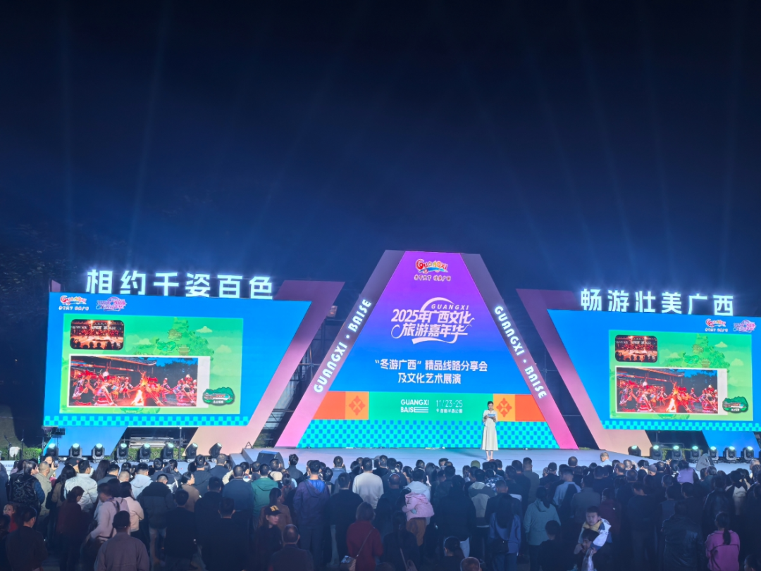 11月24日,以“相约千姿百色 畅游壮美广西”为主题的2025年广西文化旅游发展大会在百色市召开。大会现场嘉宾云集、氛围热烈,集中开展文旅推介、主题活动启动及精品展示等环节,来宾市组团精彩亮相,通过文创展品、线路分享与文艺表演,全方位展现“暖冬遇来宾・壮瑶映山水”的独特魅力。