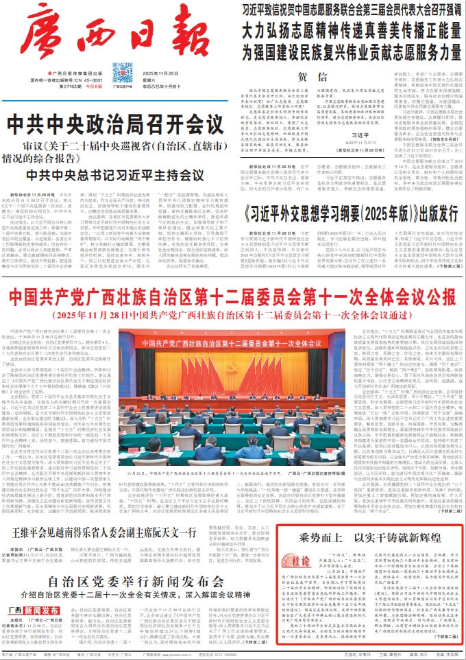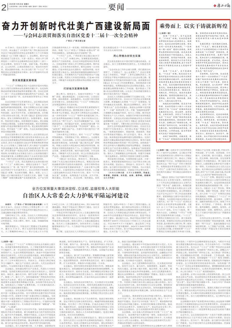 报纸版面截图。 “十四五”,阵阵鼓声激荡人心;“十五五”,声声号角催人奋进。 11月28日,中国共产党广西壮族自治区第十二届委员会第十一次全体会议在南宁召开。全会深入学习贯彻党的二十届四中全会精神,听取和讨论了陈刚同志受自治区党委常委会委托所作的工作报告,审议通过了《中国共产党广西壮族自治区委员会关于制定国民经济和社会发展第十五个五年规划的建议》,圆满完成各项议程,这对于动员激励全区广大党员干部群众凝心聚力建设新时代壮美广西具有重要意义。 党的二十届四中全会是在基本实现社会主义现代化夯实基础、全面发力的关键时期召开的一次重要会议,是乘势而上、接续推进中国式现代化建设的又一次总动员、总部署。学习宣传贯彻党的二十届四中全会精神,是当前和今后一个时期的重大政治任务。全区上下要把思想和行动统一到党的二十届四中全会精神上来,团结奋斗、锐意进取,奋力谱写中国式现代化广西篇章。 自治区党委十二届十一次全会审议通过的《建议》,坚持以习近平新时代中国特色社会主义思想为指导,深入贯彻落实习近平总书记关于广西工作论述的重要要求,深刻认识“十五五”时期的新形势新要求,对未来广西发展作出全面部署,总体思路清晰明确,目标任务求真务实,体现出中央要求、时代特征、广西特色、群众期盼,必将有力调动全社会投身新时代壮美广西建设的积极性主动性创造性。 辉煌“十四五”,实干成就精彩。“十四五”时期,自治区党委团结带领全区各族人民迎难而上、砥砺前行,成功抗击新冠肺炎疫情,有效应对一系列重大风险挑战,“一区两地一园一通道”建设扎实推进,各项事业取得新的长足发展,这是在历届自治区党委打下坚实基础上,全区上下团结拼搏、共同奋斗的结果。这些成就的取得,根本在于以习近平同志为核心的党中央领航掌舵,在于习近平新时代中国特色社会主义思想科学指引。 奋进“十五五”,实干再谱新篇。“十五五”时期,既是我区与全国同步基本实现社会主义现代化取得决定性进展的关键五年,也是加快推动高质量发展成型起势的重要窗口期。当前,我区发展环境面临深刻复杂变化,战略机遇和风险挑战并存,正发生深刻的思想之变、格局之变、思路之变、作风之变,迎来历史最好发展时期,高质量发展其时已至、其势渐成、其兴可待。抢抓机遇、真抓实干,八桂大地大有可为。 机遇是时代的馈赠,更是实干的阶梯。自治区党委十二届十一次全会明确了广西“十五五”时期经济社会发展的历史方位、重大使命、指导思想、主要目标等。全区上下必须充分认识“十五五”时期广西经济社会高质量发展的特殊性,深刻感悟广西肩负之重,清醒认识广西面临之艰,倍加珍惜广西所处之变,加力推进广西发展之要,切实增强政治责任感、历史使命感、工作紧迫感,奋力开创新时代壮美广西建设新局面。 办好广西的事情,关键在党。推动“十五五”时期经济社会高质量发展,坚持党的全面领导是根本保证。要坚决维护党中央集中统一领导,推动党的领导在八桂大地更加坚强有力。 发展是解决一切问题的总钥匙。奋进“十五五”,锚定高质量发展,全区上下必须遵循党的二十届四中全会提出的“六个坚持”重要原则,更加注重服务国家所需、发挥广西所能,更加注重人工智能赋能引领,更加注重向海发展、扩大开放,更加注重铸牢中华民族共同体意识,更加注重高质量发展和高水平安全良性互动,更加注重统筹建好政治生态和自然生态“两个生态”。 目标明确,未来可期。自治区党委十二届十一次全会提出了“十五五”时期广西经济社会发展的主要目标。全区上下要将“实干为要、创新为魂,用业绩说话、让人民评价”鲜明导向贯穿干事创业全过程,将全部心思和精力都用在干事创业、造福人民上,确保高质量发展取得显著成效,人工智能发展和科技创新水平大幅跃升,进一步全面深化改革取得新突破,对内对外开放持续扩大,社会文明程度明显提升,推进中华民族共同体建设迈出新步伐,人民生活品质稳步提高,绿色低碳转型步伐加快,南疆安全屏障更加巩固。 走过辉煌的过去,走在美好的现在,走向光明的未来,八桂儿女信念更坚定、精神更昂扬、动力更强大。实现“十五五”规划目标,责任重大、使命光荣,让我们更加紧密地团结在以习近平同志为核心的党中央周围,全面落实自治区党委决策部署,坚定信心、团结奋斗,担当实干、勠力进取,为以中国式现代化全面推进强国建设、民族复兴伟业增光添彩。 |