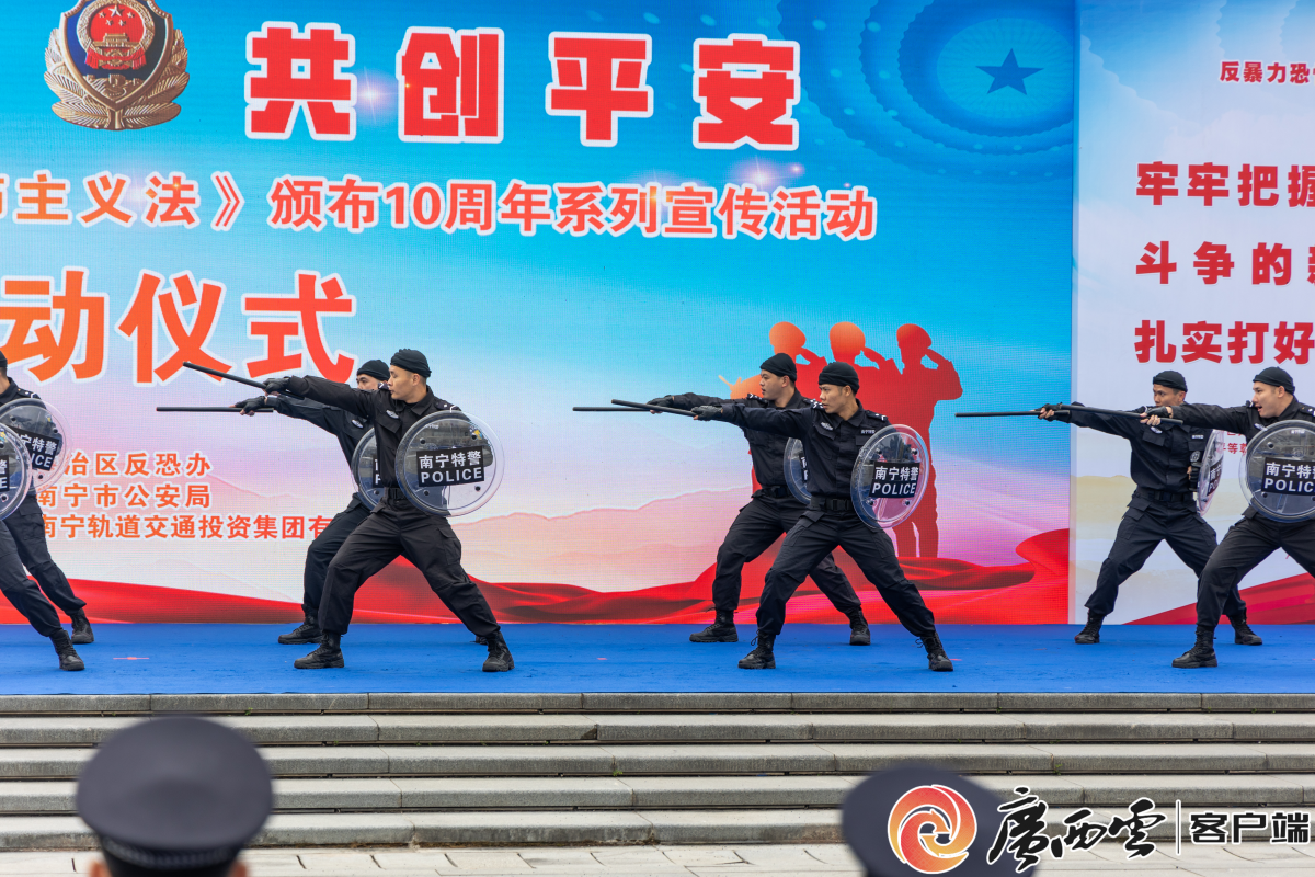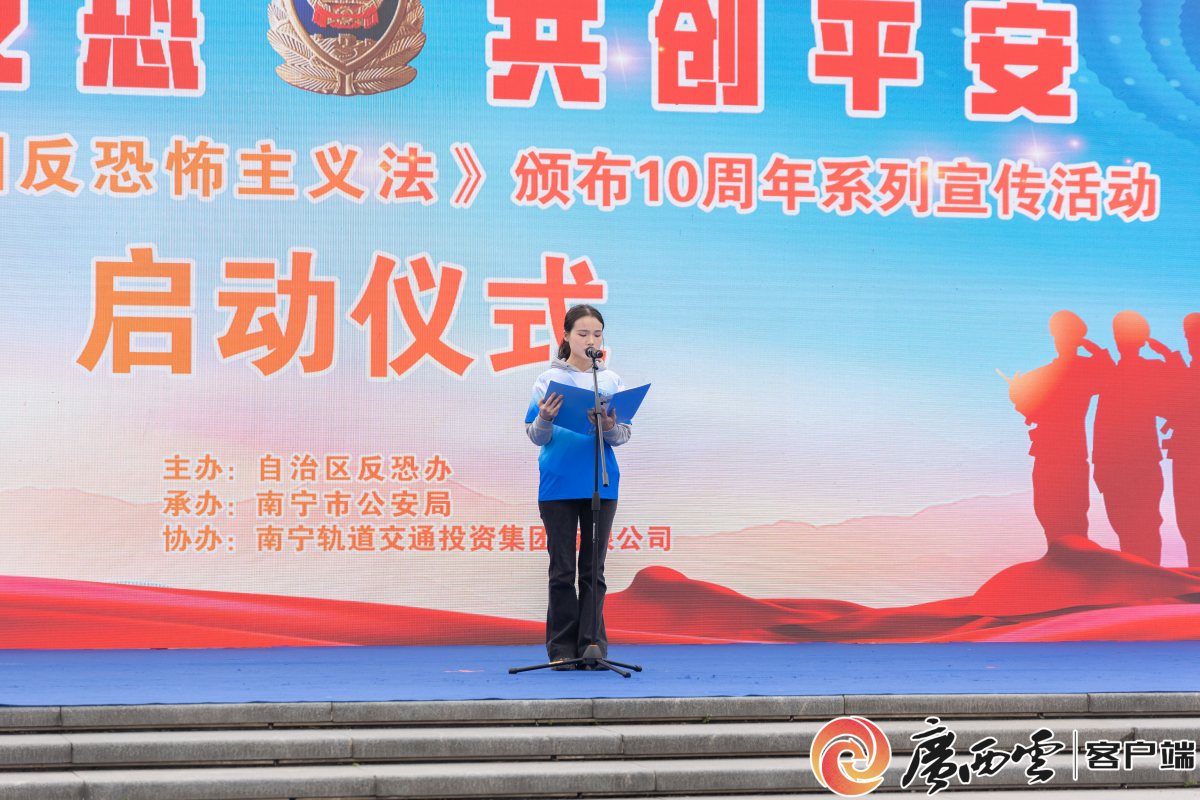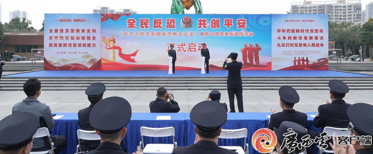 反恐宣传员代表发出倡议。广西云-广西日报记者 凌鹏 摄 据介绍,《中华人民共和国反恐怖主义法》颁布十年来,我区各级反恐部门深入贯彻总体国家安全观,以法律为保障,深化反恐宣传教育“进单位、进企业、进学校、进社区、进家庭”工作,持续提升公众安全防范意识和应对能力,将安全理念传递至千家万户,为建设法治广西、平安广西筑牢坚实屏障。 |