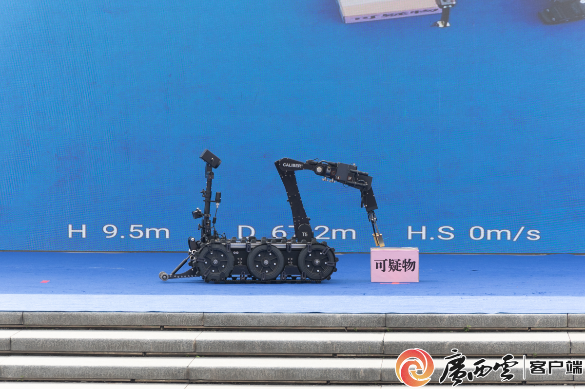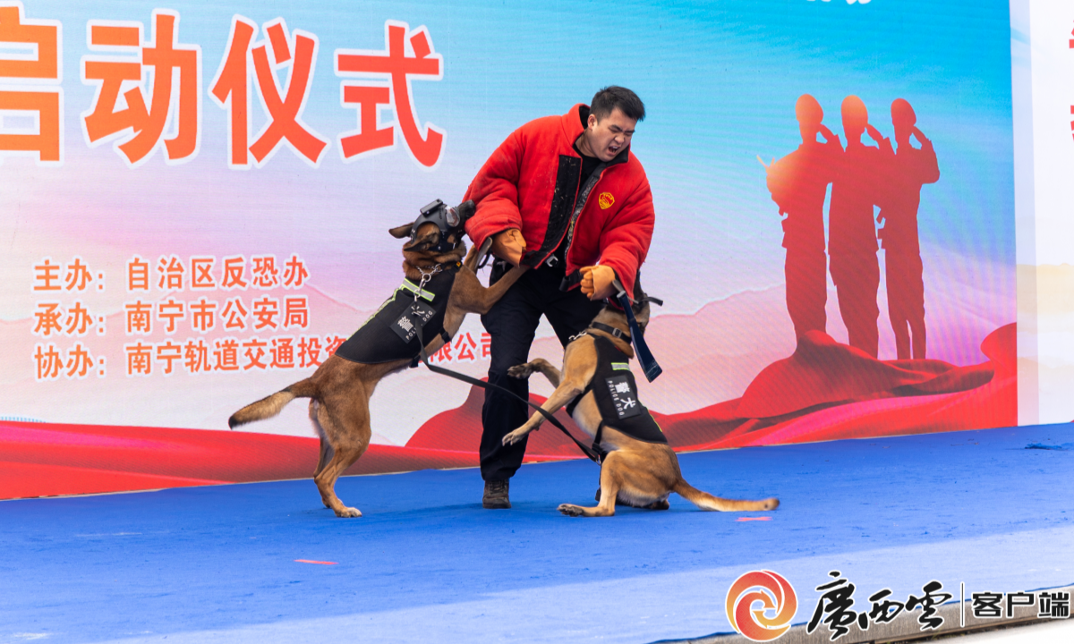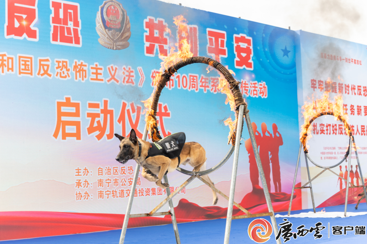 反恐宣传正式启动。广西云-广西日报记者 凌鹏 摄 活动现场,特巡警支队民警带来精彩战术表演,整齐的步伐搭配铿锵呐喊,警棍盾牌术攻防有序,劈击、截击等攻击动作利落迅猛,上防、撞击等防御姿态沉稳扎实,精准适用于高风险场景处置,尽显公安特警忠诚无畏的铁军风采。警犬表演环节亮点纷呈,治安犬、搜爆犬在训导员指令下,完成随行、跨越障碍、跳火圈、搜爆示警等多个科目,动作精准流畅,配合默契十足,充分展现反恐辅助力量的强悍战斗力,赢得现场阵阵掌声。 应急演练环节,模拟某广场发现可疑物品场景,民警快速赶赴现场设置警戒、疏散群众,指挥部联动专业力量增援,无人机侦查、机器狗探测、排爆机器人处置全程无人员接触,高新装备协同发力高效完成处置,展现专业反恐应急处突能力。