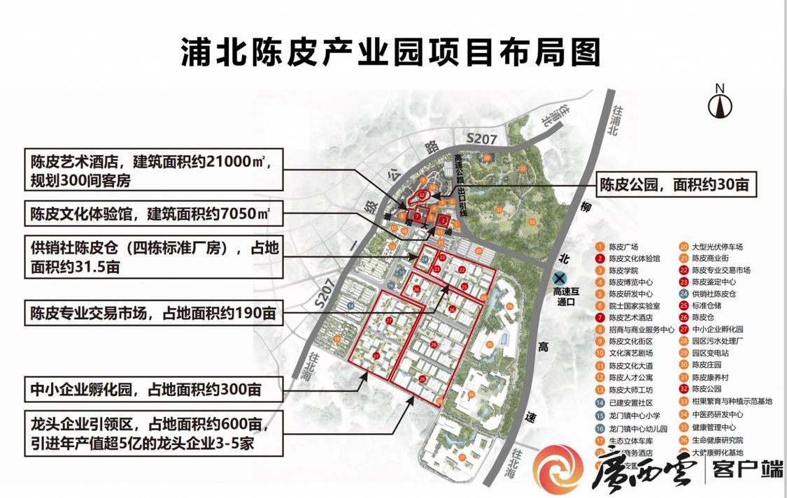 浦北陈皮产业园项目布局图。李梓富供图 “浦北陈皮产业园不仅是产业集聚的发展平台,更是推动城乡融合、提升城镇功能的重要载体。”11月11日,浦北县委书记杨永冲深入产业园调研时说。 政府的倾力投入与精准服务,引得企业纷至沓来。在广西赛金子健康产业有限公司的生产车间内,工人们正将一袋袋青柑皮装车发运。楼上,“90后”网红“十三妹”邓有志的直播声音清脆有力:“现在二红皮每天产量约5万公斤,我们已经连续发了半个月的青皮,让每一片优质陈皮走向世界!” “入驻产业园,不仅是空间的转换,更是发展能级的提升。”公司总经理陈承琦感慨道,以前小工厂生产,诸多不便;现在有了政府的规范引导、现代化的厂房和便捷的交通,信心大增,订单源源不断,当前产能已无法满足市场需求。 据李梓富介绍,目前,浦北陈皮产业园已引进柑浦堂、中皮、供销三冠、金浦龙等20多家企业投产运营,一个从种植、加工、仓储到销售、研发的完整产业集群正在形成。 品牌跃升 从土特产到国际范转换 “这一高规格、广覆盖的资源池,正是我们打破地域限制、对接全球合作伙伴的关键跳板。”浦北县副县长林家森在第八届中国国际进口博览会上说。 参展进博会,是浦北陈皮迈向世界的战略抉择。林家森表示,此举有利于提升国际知名度,让海外客商认可浦北陈皮基于珍稀老树资源、智能仓溯源和全链条标准管控的卓越品质;未来借助平陆运河通航的物流便利,争取批量出口订单,并为产业升级引进技术与投资,加速向百亿元产业链目标迈进。 进博会的亮相,只是浦北陈皮品牌跃升的精彩一瞬。回顾来时路,其“国际范”的养成,源于持续的品牌塑造与文化赋能。