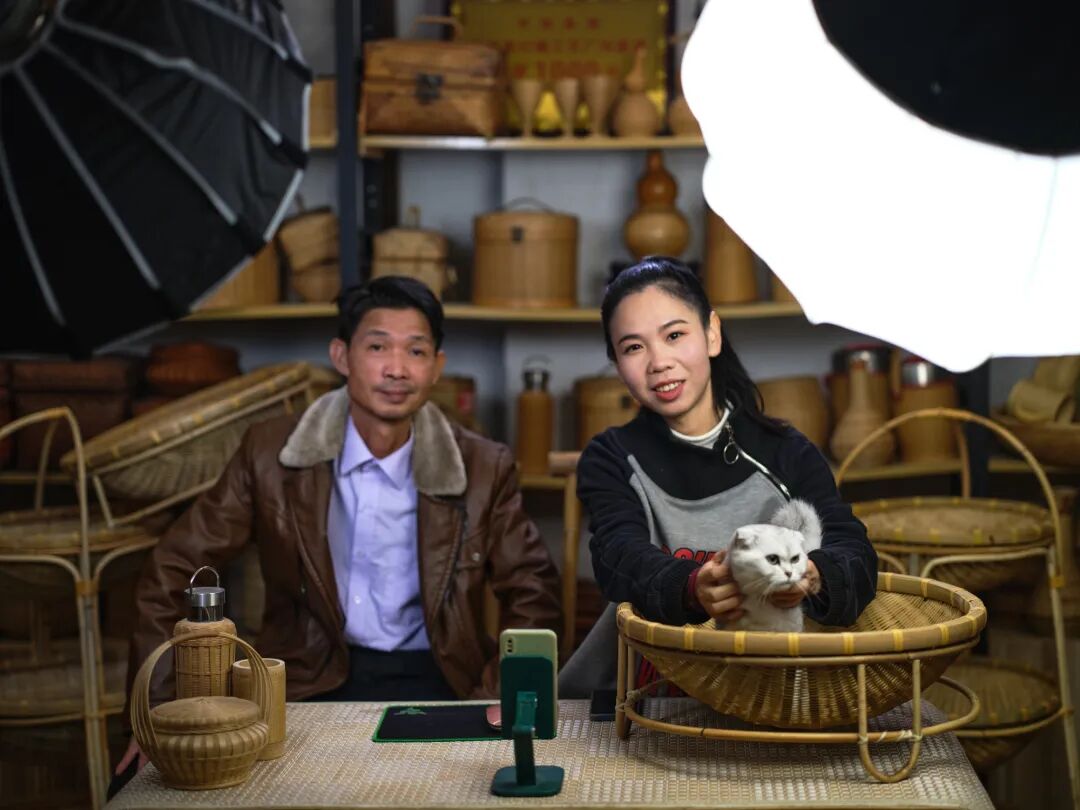 刘霞冰(右一)在工厂内进行直播带货。受访者供图 “创新才有市场!”经过对市场调研,刘霞冰推出返乡创业的第一个爆款——竹编果篮。从全国各地飞来的订单,给了她极大的信心和力量,也看到了竹编产业的新希望。 “再大点,做成猫窝,肯定好卖。”这个看似简单的建议,却如同一束光,为她打开了一扇全新的大门。 刘霞冰意识到,随着人们生活水平的提高,宠物经济正蓬勃发展,如果能将竹编与宠物用品相结合,或许能开辟出一片新市场。 于是,刘霞冰和父亲连夜设计,制作出了竹编猫窝的样品。第二天,她迫不及待地在直播中展示这款新产品。没想到,竹编猫窝一经推出,便受到了广大消费者的热烈追捧。不到两个小时,订单量就突破了200个,竹编猫窝也成为了第二个爆款产品。 “这个竹编抱枕是第三个爆款产品。”刘霞冰说,5月至7月是竹编抱枕销售旺季。 根据市场需求和网友的建议,刘霞冰不断创新设计,围绕宠物用品、居家用品、饰品,开发如狗窝、兔子窝、猫包、猫咪拉杆箱、茶几、抱枕、头饰、胸针、编织手工等产品。付出的努力也得到了市场的认可,这些产品不仅获得了5项设计专利,还成功注册了“刘家人”竹编品牌,“刘家人竹编”网店的年营业额突破100万元。2018年,灵山竹编被列入广西非物质文化遗产名录。 增收有门,产业带动发展 随着灵山竹编在互联网走红,刘霞冰积极探索产业发展新模式,开创“公司+基地+农户”的产业发展路径。 随着广西刘家人竹制品有限公司成立,刘霞冰建立竹编工艺厂作为生产基地,将订单分配给周边村民,让村民在家中利用闲暇时间进行竹编加工,然后统一回收、检验和销售,让乡亲们实现“家门口”就业。 “以前做临时工,干活累,收入低,2021年到刘家人竹编工作,时间灵活,还能照顾家庭,收入比以前还高。”工人梁海芬忙活着手上的工作高兴地说。 “每设计出一个新款,我们都会利用晚上时间进村或者组织村民到基地进行培训。”刘霞冰说,竹编虽然采用的是传统的编织技法,但是按照现代人的审美观,在产品设计方面融入了一些形状、图案、文案之类的新元素,所以对编织技艺也有新的要求。