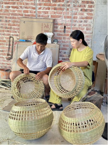 刘霞冰(左一)认真向父亲刘家盛(右一)学习竹编技艺。受访者供图 初心如磐,传承竹编文化 “刘家人”竹编工艺车间里欢声笑语,七八名妇女一手拿剪刀,一手拿砂纸,一会挑出毛刺,一会用砂纸打磨,一会又用手去抚摸,体验竹编表面的丝滑感觉。 “虽然霞冰是我的女儿,我还是要感谢她,她不但让家里的竹编生意起死回生,还让灵山竹编文化得以传承和发扬。”8月5日,看着繁忙的生产车间,做了一辈子竹编的刘家盛内心充满骄傲。 在市场的冲击下,20世纪90年代起,灵山竹编逐渐由兴转衰,竹编手艺人日渐凋零,让竹编人止不住心痛,刘霞冰心中亦是不舍。 在城市闯荡的刘霞冰,曾一直尝试用各种途径来宣传灵山竹编,然而事倍功半。 “传承了上千年的灵山竹编,就要消失在时代浪潮中了吗?”2016年,不服输的刘霞冰毅然放弃了好不容易在大城市打拼出的蒸蒸日上的事业,回到家乡。在父亲的指导下,刘霞冰从零开始,学习竹编技艺,虚心向村里的竹编老手艺人请教,仔细观察他们的手法和技巧,不断实践和摸索,力求将每一个细节都做到极致,同时通过电商平台直播推介。