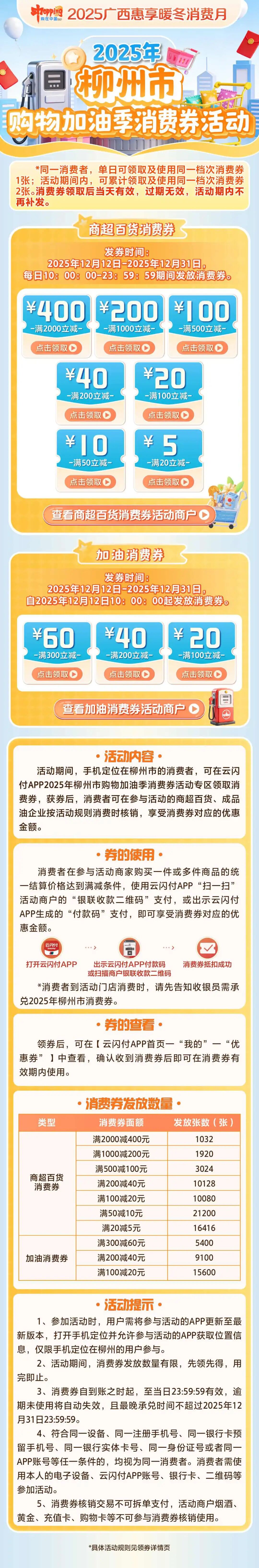 12月12日,记者从市商务局了解到,2025年柳州市购物加油季消费券活动已启动,发放商超百货消费券、加油消费券2种消费券,发券时间为12月12日至31日。 商超百货消费券自2025年12月12日10:00:00起发放,消费者可于每日10:00:00至23:59:59领取消费券,包括5元、10元、20元、40元、100元、200元、400元共7档金额。 加油消费券自2025年12月12日10:00:00起发放,包括20元、40元、60元共3档金额。 怎么领 活动期间,手机定位在柳州市的消费者,可在云闪付App的2025年柳州市购物加油季消费券活动专区领取消费券,获券后,可在参与活动的商超百货门店、成品油企业按活动规则消费时核销,享受消费券对应的优惠金额。 值得注意的是,同一消费者,单日可领取及使用同一档次消费券1张;活动期间,可累计领取及使用同一档次消费券2张。消费券领取后当天有效,过期无效,活动期内不再补发。