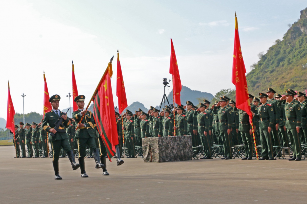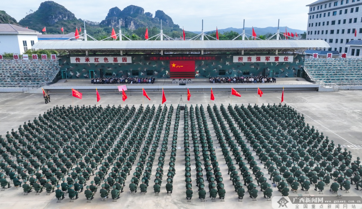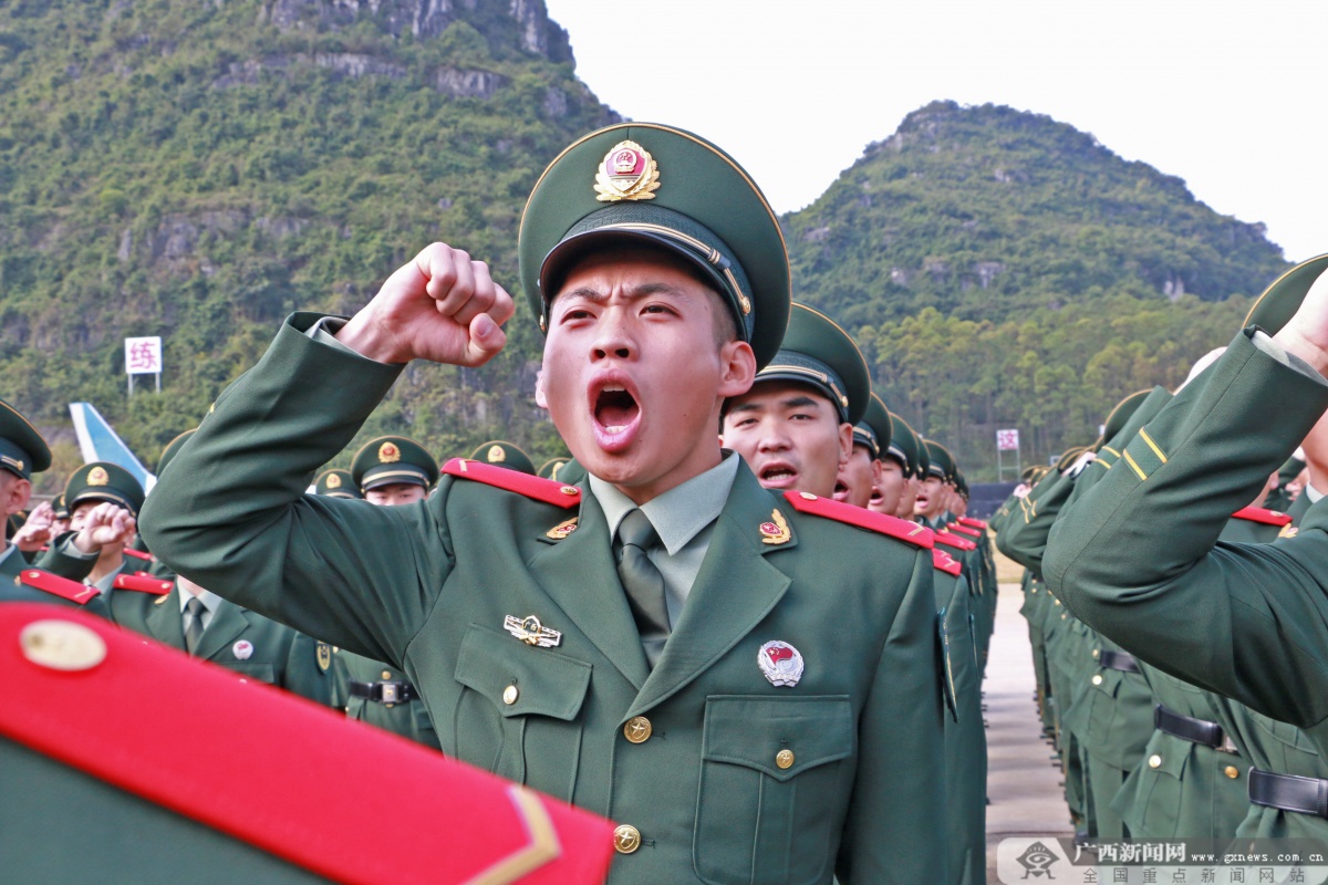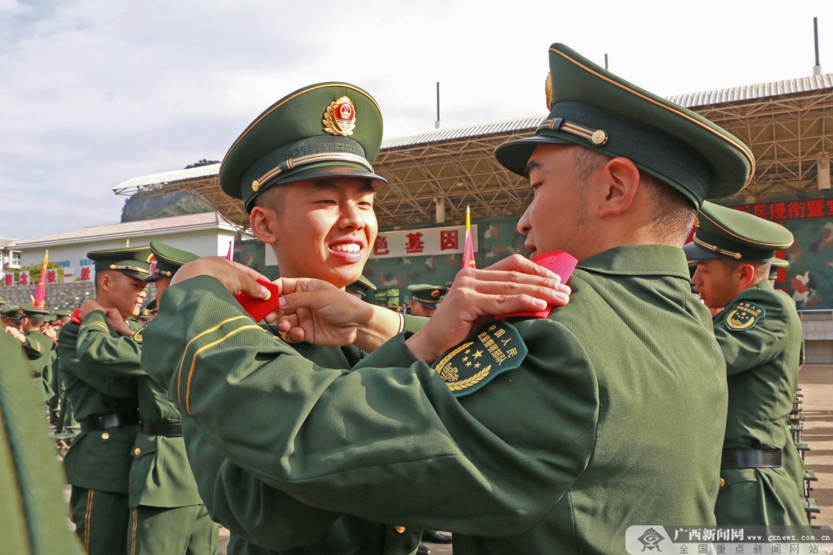 秋季新兵授衔暨宣誓仪式现场。通讯员 黄嘉伟 摄 广西新闻网南宁12月17日讯(通讯员 潘昕 唐向明 张哲凝 杨倩)肩章耀荣耀,誓言砺忠诚,授衔既是军旅生涯的新起点,更是青春奋斗的新征程。2025年12月15日,武警广西总队新训团隆重举行秋季新兵授衔暨宣誓仪式。经过三个月的淬火历练,新兵们褪去青涩、淬炼成钢,顺利实现从地方青年到合格军人的蜕变,迎来军旅生涯中意义非凡的“成人礼”。 护旗手高擎武警部队旗,全场官兵向旗帜致以崇高敬礼。通讯员 唐向明 摄 伴随着庄严的《中国人民解放军军歌》,授衔仪式正式拉开帷幕。全体官兵身着崭新军装,精神抖擞、身姿挺拔,眼神中饱含着对军旅生涯的憧憬,昂扬的士气尽显新时代青年军人的蓬勃朝气,新兵们以最饱满的状态迎接属于自己的军旅“高光时刻”。 新兵们互相佩戴警衔、整理戎装。通讯员 唐向明 摄 “我是中国人民武装警察部队军人,我宣誓……”在领誓人的带领下,全体新兵庄严宣誓。铿锵有力的誓言响彻营区,字字千钧、句句铿锵,既是对忠诚使命的庄严承诺,更是对保家卫国的坚定决心。军旗猎猎指引航向,誓言铮铮凝聚力量,相信新兵们必将以炙热青春践行初心,以纯粹信仰诠释军人担当。