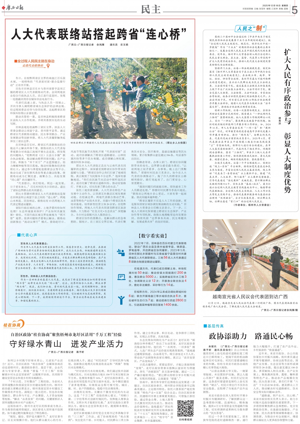 田林县那比乡那腊村人大代表前往云南省富宁县阿用乡新街村学习沃柑种植技术。那比乡人大 供图 冬日,在桂黔两省区交界的南盘江百乐段水域,一场特殊的“代表面对面·联合监督行动”正有序开展。 百色市田林县百乐乡与贵州省册亨县双江镇的跨省区人大代表联络站代表,会同两地农业综合行政执法人员,沿江进行巡查时,发现一处隐蔽河湾存在疑似非法电鱼行为。 代表们迅速上前,与执法人员一同制止,并向当事人阐明跨省域生态保护的法律法规。经过现场普法劝导与协同处置,这起跨省区的环保纠纷得以妥善处置。 联动共管的一幕,是田林县积极探索跨省区县际人大合作机制,并将其落到实处的生动写照。 田林县地处桂滇黔三省区交界,该县人大常委会联动云南富宁县、贵州册亨县等,通过跨省区代表联络站建设、民生事项联办、产业发展联动等创新举措,将人大代表履职触角延伸至三省区边界。 在田林县百乐村,跨省区代表联络站的功能远不止解决环保个案。联络站的人大代表每季度联合对南盘江流域开展生态巡查,将发现的问题纳入“桂黔两省(区)五县五乡镇”联合执法框架,推动解决跨界环保问题;在产业方面,积极为“双千双万”产业蓝图建言,助力辣椒种植等项目落地,推动村级集体经济持续壮大;通过参与季度轮值联席会议等平台,推动完成了深化移风易俗等重点建议收集,使联络站成为汇聚民意、凝聚合力、共绘发展“同心圆”的关键环节。 “代表搭台,我们唱戏,两边一起发展,日子更有奔头。”百乐村村民韦少田的话,道出了省际边界群众的共同感受。 那比乡那腊村跨省区人大代表联络站是架在田林县和云南富宁县之间的“连心桥”。两地山水相连、民俗相近,联络站有13名两地人大代表定期进站履职。 省际行政区域的山林、土地矛盾纠纷如何处理?生态环境谁来保护?产业如何共赢发展?曾经,不同行政区域交界处被视为“两不管”地带,很多问题和矛盾难以解决。联络站创新推出“流动议事厅”模式,借助赶圩日、风流节等民族节庆契机开展“代表面对面”活动,成功协调解决了跨省区道路建设、山林权属纠纷等多个民生难题,成功调解山林权属、建房纠纷20余起。 那比乡人大代表陆正昌在与云南代表共同履职的过程中,深深感受到跨省区协作带来的温暖与力量。“跨省区协作让我们打破了地域局限,真正做到了为民服务不分边界。”他深有感触地说,“我们在民族节庆活动中倾听选民诉求,成功化解了跨省区道路纠纷,推动安装路灯、开展义诊,切实改善了群众的生活。” 依托三地资源禀赋,人大代表在特色产业发展中主动作为,以资源互补激活区域发展新动能。在桂滇边界,两地代表联合推动芒果、油茶等特色产业技术共享,共建5个跨省区技术培训基地,培育新型经营主体20余家;在桂黔协作领域,两地人大代表共同谋划跨省区旅游线路,大力推动“红色文化+生态农业”深度融合,为乡村全面振兴注入强劲动力。 跨省区协作的落脚点,是解决群众的急难愁盼。据统计,在三省区交界区域,代表们聚焦饮水安全、医疗教育、基础设施建设等民生领域,累计收集群众意见建议356条,均妥善作出回应。 抬脚进邻省,办事入家门。跨省区协同履职带来的变化,边界群众感受最为真切。“以前两地之间矛盾多、办事难,晚上出门黑黢黢的。”那腊村村民农兰英表示,如今在人大代表的协调推动下,拖了许久的跨省区公路顺利修好,路灯亮起来了,出门更安全、心里更踏实。 “遇到问题扫码就能反映,很快就有工作人员跟进处理。”那腊村村民谭韦李高兴地说,“联络站让两地乡亲心更近,大家有事一起商量,彼此间越来越和睦。” “跨省区履职不仅是人大工作的创新,更是服务国家区域协调发展战略的生动实践。”田林县人大常委会主任赖文洁表示,下一步,三地人大将深化探索建立跨省区生态保护、产业协作等专项机制,助推从地理毗邻走向发展协同,持续巩固“边界事务共商、民生难题共解、发展成果共享”的良好局面。