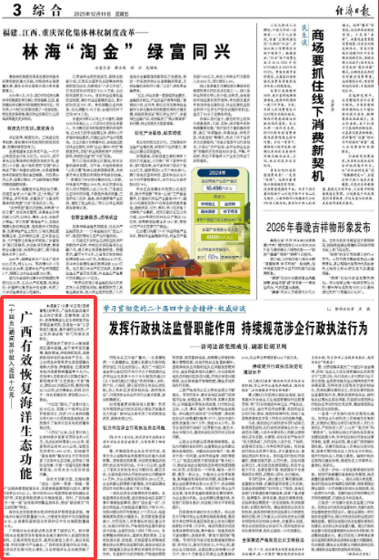 12月19日,《经济日报》第3版报纸版面截图。 近年来,广西系统推进海洋生态保护修复,在珊瑚礁、红树林、海滩等典型生态系统修复方面取得显著成效,探索出一条“生态修复打基础、惠民增收促长效、产业发展增动能”的可持续发展路径。