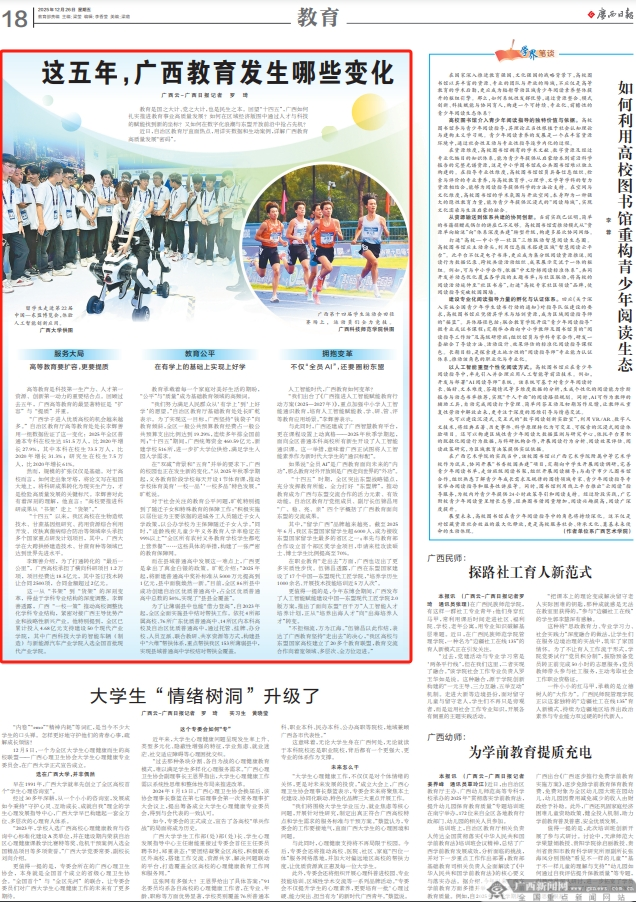 广西第十四届学生运动会田径赛场上,运动员们全力竞技。广西科技师范学院供图 教育公平 在有学上的基础上实现上好学 教育承载着每一个家庭对美好生活的期盼,“公平”与“质量”成为基础教育领域的高频词。 “我们努力满足人民群众从‘有学上’到‘上好学’的愿望。”自治区教育厅基础教育处处长旷乾表示。为了实现这一目标,广西坚持“钱袋子”向教育倾斜,全区一般公共预算教育经费占一般公共预算支出比例达到19.29%,连续多年排全国前列;“十四五”期间,广西统筹资金460.59亿元,新建学校516所,进一步扩大学位供给,满足学生入园入学需求。 在“双减”背景和“五育”并举的要求下,广西的校园也正在发生新的变化。“从2025年秋季学期起,义务教育阶段学校每天开设1节体育课,推动学校体育美育‘一校一品’‘一校多品’特色发展。”旷乾说。 对于社会关注的教育公平问题,旷乾特别提到了随迁子女和特殊教育的保障工作:“积极实施以居住证为主要依据的进城务工人员随迁子女入学政策,以公办学校为主保障随迁子女入学。”同时,“适龄残疾儿童少年义务教育入学率稳定在99%以上”“全区所有农村义务教育学校学生都吃上营养餐”……这些具体的举措,构建了一张严密的教育保障网。 而在县域普通高中发展这一难点上,广西更是拿出了真金白银的政策。旷乾介绍:“2025年起,将新建普通高中奖补标准从5000万元提高到1亿元,县中面貌焕然一新。”目前,全区86所县中成功创建自治区优质普通高中,占全区优质普通高中总数的50%,实现了“县县全覆盖”。 为了让薄弱县中也能“借力登高”,自2023年起,全区全面实施县中结对帮扶工作。依托4所部属高校、76所广东优质普通高中、14所区内本科高校及自治区优质普通高中,通过托管、挂牌、办分校、人员互派、联合教研、共享资源等方式,构建县中“六维”帮扶体系,重点帮扶我区153所薄弱县中,实现县域普通高中学校结对帮扶全覆盖。 拥抱变革 不仅“全员AI”,还要圈粉东盟 人工智能时代,广西教育如何变革? “我们出台了《广西推进人工智能赋能教育行动方案(2025—2027年)》,重点加强中小学人工智能通识教育,培育人工智能赋能教、学、研、管、评等教育应用场景。”李辉善表示。 与此同时,广西还建成了广西智慧教育平台,更在课程设置上动真格——2025年秋季学期起,面向全区普通本科高校所有新生开设了人工智能通识课。这一举措,意味着广西正试图将人工智能素养作为新时代大学生的“通识标配”。 如果说“全员AI”是广西教育面向未来的“内功”,那么教育对外开放则是广西走向世界的“外功”。 “十四五”时期,全区突出东盟战略锚点,充分发挥教育所能,全力打好“东盟牌”,推动教育成为广西与东盟交流合作的活力元素、有效动能。自治区教育厅党组成员、副厅长伍锦昌用“广、稳、亮、亲”四个字概括了广西教育面向东盟的交流成果。 其中,“留学广西”品牌越来越亮。截至2025年6月,我区东盟国家留学生超6000人,成为接收东盟国家留学生最多的省区之一;率先与教育部合作设立首个部区奖学金项目,申请来桂攻读硕士、博士学生比例提高至70%。 在职业教育“走出去”方面,广西也迈出了更多实质性步伐。伍锦昌透露,广西在东盟国家建设了17个中国—东盟现代工匠学院,“培养学历生1000余名、开展技术技能培训近5万人次”。 更值得一提的是,今年东博会期间,广西发布了人工智能赋能建设中国—东盟现代工匠学院2.0版方案,推出了面向东盟“百千万”人工智能人才培养计划,正从“培养出海人才”向“出海培养人才”转变。 “不拒细流,方为江海。”伍锦昌以此作结,表达了广西教育坚持“走出去”的决心,“我区高校与东盟国家高校建立了20多个教育联盟,教育交流合作向着宽领域、多层次、全方位迈进。”