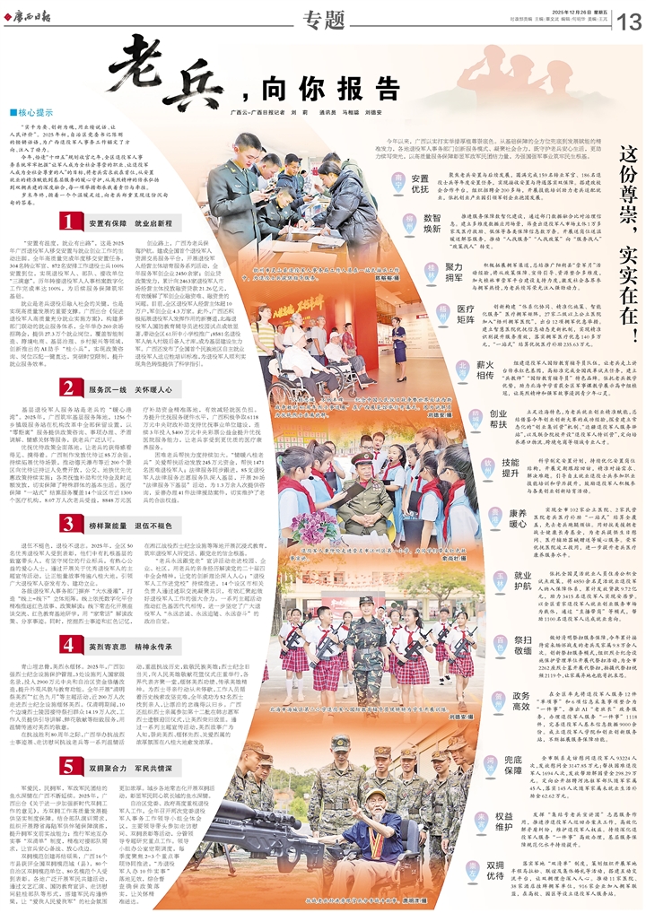 “八桂忠魂 不朽丰碑—纪念中国人民抗日战争暨世界反法西斯战争胜利80周年烈士事迹展”在广西展览馆举行开幕式。图为讲解员为抗战烈士亲属讲解。通讯员 刘德安 摄 在抗战胜利80周年之际,广西举办抗战烈士事迹展、走访慰问抗战老兵等一系列温情活动,重温抗战历史,致敬民族英雄;烈士纪念日当天,向人民英雄敬献花篮仪式庄重举行,各界代表齐聚一堂,缅怀英烈功绩、传承英雄精神。为烈士寻亲行动从未停歇,工作人员循着历史线索攻坚克难,全年成功为52名烈士找到亲人,让漂泊的忠魂得以归乡。广西还组织烈士亲属参加第十二批在韩志愿军烈士遗骸迎回仪式,让英烈荣归故里。通过一系列主题宣传活动,英烈故事广为人知,崇尚英烈、缅怀先烈、关爱烈属的浓厚氛围在八桂大地愈发浓厚。 5 双拥聚合力 军民共情深 军爱民,民拥军,军政军民团结的鱼水深情在广西不断延续。2025年,广西出台《关于进一步加强新时代双拥工作的意见》,为双拥工作高质量发展提供坚实制度保障。结合部队演训需求,组织开展跨省海陆军供伴随保障演练,提升拥军支前实战能力;推行军地互办实事“双清单”制度,精准对接部队需求,让官兵安心备战、放心戍边。 双拥模范创建再结硕果,广西16个市县获评全国双拥模范城(县),80个自治区双拥模范单位、80名模范个人受到表彰。各地广泛开展军民共建活动,通过文艺汇演、国防教育宣讲、走访慰问驻桂部队等形式,搭建军民沟通桥梁,让“爱我人民爱我军”的社会氛围更加浓厚。城乡各地常态化开展双拥活动,彰显军民同心筑长城的鱼水深情。 自治区党委、政府高度重视退役军人工作,全年召开两次党委退役军人事务工作领导小组全体会议,主要领导带头参加走访慰问、双拥表彰等活动,分管领导专题研究重点工作。领导小组办公室定期调度,每季度聚焦2-3个重点事项协同推进,“为退役军人办10件实事”落地见效,综合督查确保政策落实,让关怀精准送达。 这份尊崇,实实在在! 今年以来,广西以实打实举措厚植尊崇底色。从基础保障的全方位兜底到发展赋能的精准发力,各地退役军人事务部门创新服务模式、凝聚社会合力,既守护老兵安心生活,更助力续写荣光,以高质量服务保障彰显军政军民团结力量,为强国强军事业筑牢民生根基。 南宁 安置优抚 聚焦老兵安置与后续发展,圆满完成159名转业军官、186名退役士兵等年度安置任务,实现接收安置与待遇落实双保障。搭建政校企合作平台,组织招聘会200多场,开展技能培训助力老兵适配就业,依托创业产业园引领军创企业抱团发展。 柳州 数智焕新 推进服务保障数智化建设,通过部门数据融合比对治理信息。建立多维度数据应用场景,筛查出退役军人市场主体1万多家及医疗救助、低保等各类保障信息数万条。开展送岗位送温暖送解答服务,推动“人找服务”“人找政策”向“服务找人”“政策找人”转变。 桂林 聚力拥军 积极拓展拥军渠道,总结推广阳朔县“崇军月”活动经验,将从政策保障、宣传引导、资源整合多维度,加大桂林市崇军平台建设支持力度,激发社会各界参与拥军热情,为老兵续写荣光注入强劲动力。 梧州 医疗矩阵 创新构建“体系化协同、精准化施策、智能化服务”医疗拥军矩阵,27家二级以上公立医院加入“梧州拥军医院”,出台12项拥军优惠举措。建立智慧医院优抚信息动态更新机制,实现精准识别提升服务质效,落实拥军医疗优惠140多万元,“一站式”结算优抚医疗补助235.63万元。 北海 薪火相传 组建退役军人国防教育辅导员队伍,让老兵走上讲台传承红色基因,高标准完成全国改革试点任务,建立“兵教师”“国防教育辅导员”特色品牌。依托老兵教学优势,助力北海中学首获全区军事课教学展示高中组桂冠,让英烈精神和强军故事浸润青少年心灵。 防城港 创业帮扶 立足边海特色,为老兵就业创业精准赋能,总结借鉴今年创业创新大赛的成功经验,探索建立常态化的“创业集训营”机制、“边疆退役军人服务驿站”,以及联合院校开设“退役军人特训营”,定向培养港口物流、跨境电商等领域专业人才。 钦州 技能提升 科学制定安置计划,持续优化安置岗位结构,开展定期跟踪回访,精准对接需求、解决难题。引导自主就业退役士兵参加职业技能培训和学历提升,鼓励退役军人积极参与各类创业创新培育活动。 贵港 康养暖心 实现全市102家公立医院、2家民营医院老兵医疗补助“一站式”结算全覆盖,免去老兵跑腿烦恼。用好抗美援朝老战士健康长寿基金,为老兵提供生日慰问、医疗辅助器械赠送等暖心服务。荣军优抚医院竣工投用,进一步提升老兵医疗康养服务水平。 玉林 就业护航 依托全国灵活就业人员住房公积金试点政策,将4850余名灵活就业退役军人纳入保障体系,累计发放贷款9.72亿元,助力3415名退役军人实现安居梦。以全区首家退役军人就业创业服务市场为载体,通过“直播带岗”等模式,帮助1100名退役军人达成就业意向。 百色 祭扫敬缅 做好清明祭扫服务保障,今年累计接待前来缅怀战友的老兵及家属9.8万余人次。创新祭扫服务模式,组织烈士纪念设施保护管理单位开展代祭扫活动,为全市2262座烈士墓开展代祭扫,拍摄代祭扫视频2119个,让家属异地也能寄托哀思。 贺州 政务高效 在全区率先将退役军人服务12件“单项事”和6项信息采