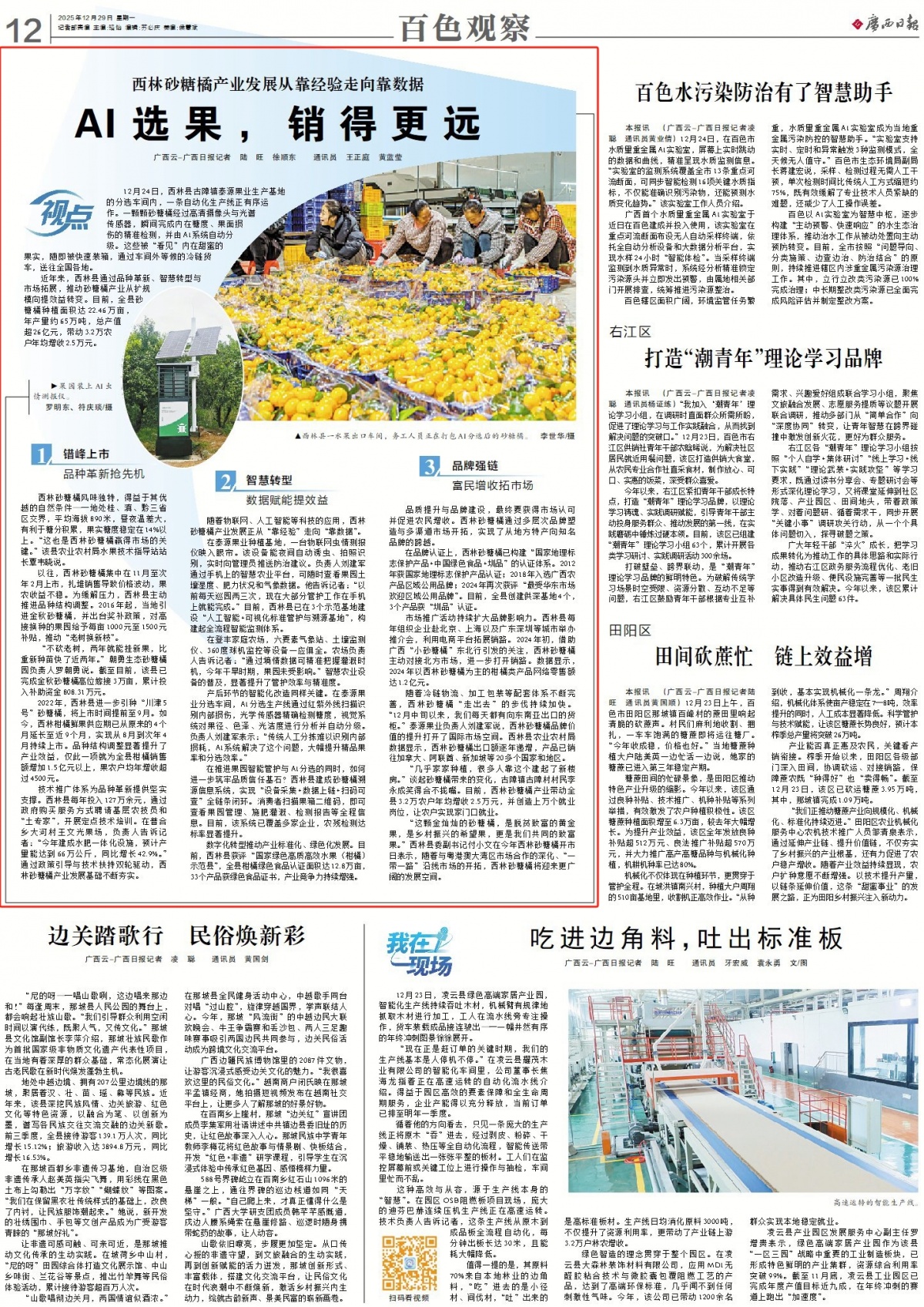 报纸版面截图。 12月24日,西林县古障镇泰源果业生产基地的分选车间内,一条自动化生产线正有序运作。一颗颗砂糖橘经过高清摄像头与光谱传感器,瞬间完成内在糖度、果面损伤的精准检测,并由AI系统自动分级。这些被“看见”内在甜蜜的果实,随即被快速装箱,通过车间外等候的冷链货车,送往全国各地。 近年来,西林县通过品种革新、智慧转型与市场拓展,推动砂糖橘产业从扩规模向提效益转变。目前,全县砂糖橘种植面积达22.46万亩,年产量约65万吨,总产值超26亿元,带动3.2万农户年均增收2.5万元。 错峰上市 品种革新抢先机