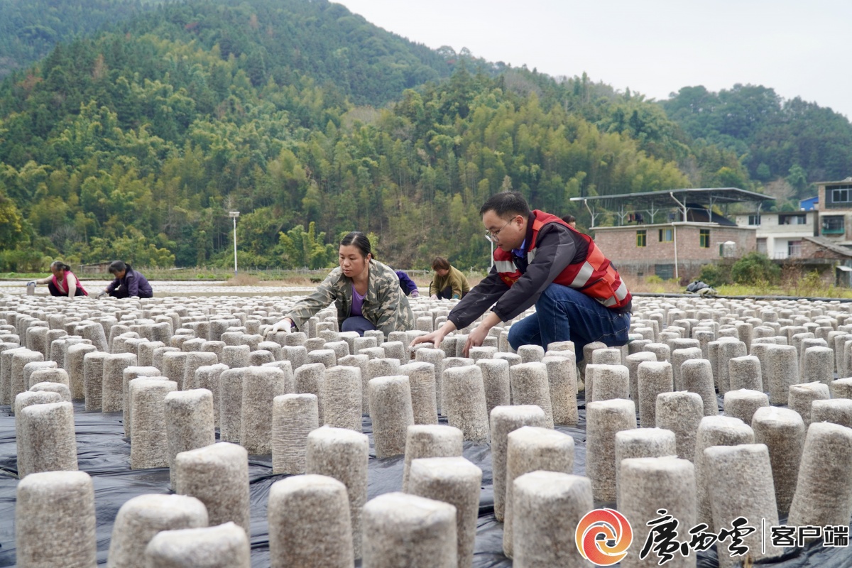 冬日的三江侗族自治县斗江镇扶平村,连片冬闲田褪去了秋收后的沉寂,身穿红马甲的驻村工作队与村民们蹲在黑膜铺就的田垄上并肩劳作。起落间,一个个木耳菌棒被稳稳排开,行列齐整如阵——这些敦实的 “银灰柱”,正以冬日里的忙碌姿态,成了乡村全面振兴图景里孕育希望的 “金棒”。