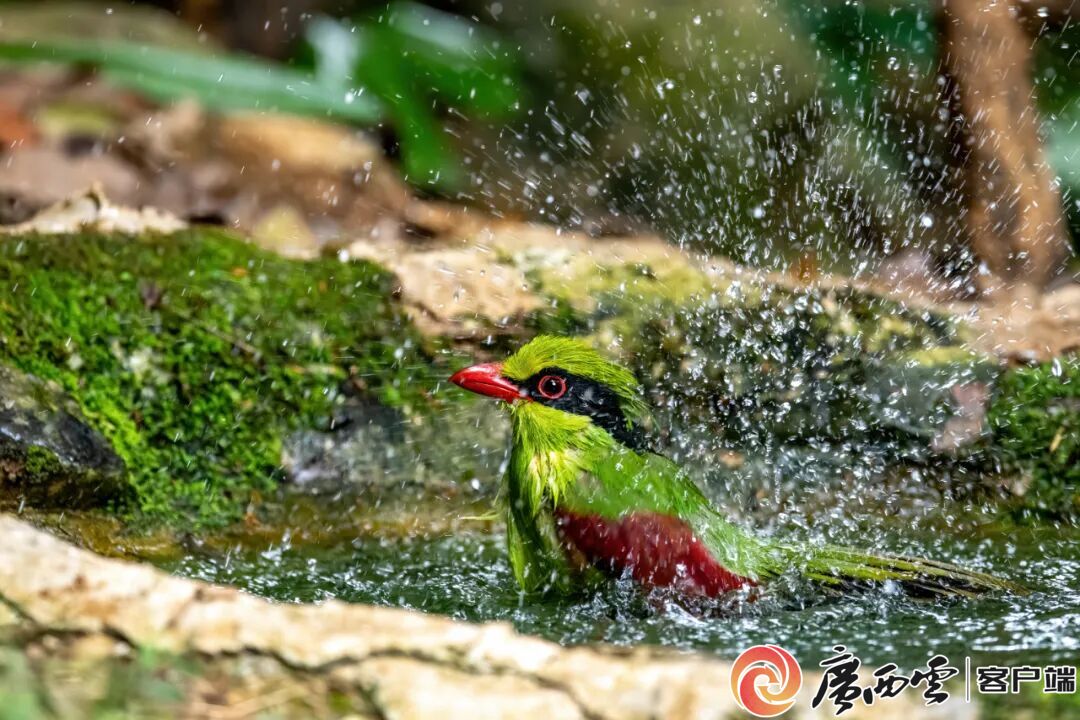 印支绿鹊在鸟塘洗澡。 “因为过去穷,身居山里的村民半年难得吃上一餐肉,为改善伙食,就去抓鸟、打鸟、吃鸟。”拍鸟间隙,农建酬对记者说,为吃上一餐鸟肉,村民们想的办法层出不穷:掏鸟、套鸟、网鸟、粘鸟,还用上了弹弓、砂枪,当地有名的犀鸟难觅踪影了。 “现在生态好了,这里的鸟儿比过去还多,常见的就有二三十种,弄岗穗鹛、印支绿鹊、红顶鹛、长尾阔嘴鸟、蓝背八色鸫、褐冠鹃隼、白眉棕啄木鸟、黄腹花蜜鸟、黑枕王鹟、金眼鹛雀、白翅蓝鹊、蓝须夜蜂虎等。”农建酬扳起指头如数家珍,俨然一个鸟类专家。