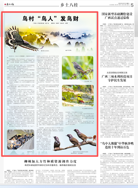 蛇雕正在捕食。 周高龙说,过去他以种蔗为生,收入平平,见同村“鸟人”靠鸟发财,很有些“眼红”。一次,他无意中发现自家屋旁大树上常有蛇雕出没,便试着买来小蛇投喂,一来二去,蛇雕便成了他的朋友,哨子一响,便来接食。这一猛禽空中抓蛇的瞬间,就成了拍鸟发烧友们的最爱,周高龙也名正言顺加入到“鸟人”行列。 周高龙悄悄告诉记者:“一个拍摄机位收费100元,今天收入有3000多元。拍摄黄金季节,最多一天进账超7000元,3个月下来就把小车买回家啦。不到3年,赚了30多万元。”得意的笑容挂满了他的脸上。 为让观鸟经济这把火更热更旺,弄岗保护区管理中心和龙州县政府不断“添柴加薪”。组织村民前往云南等地学习筑鸟塘、搞民宿;聘请厨师手把手教村民学厨艺、做菜肴;成立观鸟协会,开设12条观鸟线路。仅2017—2019年,县里就投入资金2000多万元,完善观鸟基地周边村屯的基础设施。道路硬化、改厨改厕、排水排污管网、停车场、太阳能路灯,一样不少。观有美景,食有佳肴,行有道路,住有民宿,购有特产。“鸟村”的面貌焕然一新,游客拍客常年络绎不绝,全国各地以及英国、美国、斯里兰卡等国家的拍客在此留下了美好记忆。