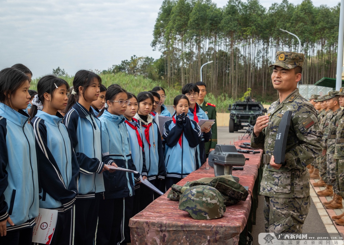 武警官兵为师生们介绍武器装备。通讯员 王斐 摄 广西新闻网崇左12月30日讯(通讯员 王斐 赵天钰 刘坚)12月26日,武警广西总队崇左支队邀请驻地中学师生走进营区,开展以“走进军营,感知国防”为主题的开放日活动,通过实地参观、互动体验等方式,让师生零距离感受部队生活、领略军人风采,进一步增强全民国防观念。