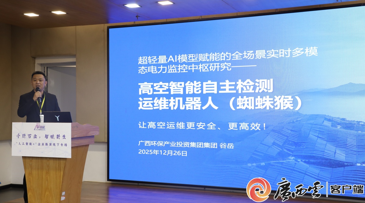 中国—东盟博览会绿色低碳展会现场。 破局:以精准落子链通产业生态 环保产业的竞争力,在于关键领域实现从无到有、从有到优的跨越。 广西环保集团以两个“首个”落子,精准切入产业薄弱环节,树立行业新标。2025年12月17日,中国—东盟高端绿色装备智造产业园项目完成股权摘牌,全面进入续建运营准备阶段。这一集团公司首个装备制造产业项目,志在打造“立足广西、面向东盟”的“工贸物金一体化”综合平台。 “它彻底补齐了我们产业链中制造环节的空白。”该项目负责人指出。从环保服务提供商向“服务+制造”综合解决方案商转型,构建起联动闭环的环保全产业生态圈,这一跃迁意味着更高的产业附加值和更强的市场话语权。 与此同时,另一项“零的突破”同步达成。广西环保集团成功中标全区首个绿证采购项目,促成的859万张绿证交易,相当于每年节能260万吨标准煤,减少碳排放约850万吨,植树约3亿棵。这不仅是简单的商业行为,更是为广西构建绿色电力交易市场探索了一套可复制、可推广的“环保方案”,直接服务于区域“双碳”目标。 智创:以科技赋能攻克环保痛点 科技创新是环保事业从“治标”走向“治本”的必由之路。广西环保集团将2025年定为“科技创新攻坚年”,一系列研发成果在实验室与工程现场同步涌现。 广西环保集团亮相“千行百业,智赋新生 ——‘人工智能 +’企业路演线下专场活动” 自治区科技厅的立项名单成为创新之路上的生动注脚:广西环保集团获批5个自治区级科技创新项目,立项数量在集团公司各单位中位列第一。这些项目精准锚定行业痛点、难点问题——“尖锋”行动“非粮生物氢能高效制备与清洁利用关键技术研发及应用” 致力于攻关非粮生物质制备氢能技术,探索清洁能源新路径;“智果”行动钻研垃圾渗滤液原位氧化处理技术,直面城镇垃圾处理的顽固难题;“赋能”行动开发新型生物质复合气凝胶吸附剂,为重金属污染治理提供创新方案。 自主研发成果持续积累。全年新增授权专利及软件著作权16项,累计持有发明专利3项、实用新型专利44项。广西环保集团所属环投金溢公司成功获批国家高新技术企业,入库广西科技型中小企业名单,增添一块“国字号”科创招牌。牵头编制的《广西生活垃圾焚烧飞灰处理技术应用指南》和《乡镇生活污水处理设施智慧化运维管理规程》于2025年正式实施。这两项地方标准,填补了广西在危险废物精细化管理与乡镇水务智慧化运维领域的空白,将“广西经验”上升为“广西规范”。