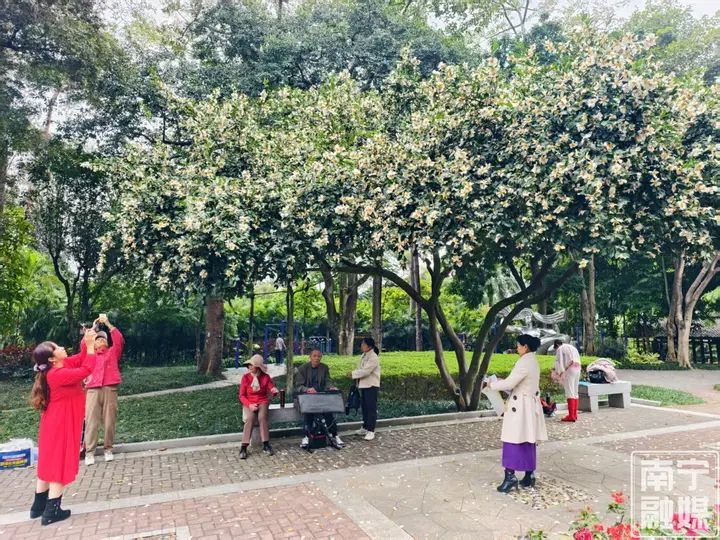 近日,有市民在南宁市人民公园游玩时发现,在毛主席接见各族人民纪念馆前的红太阳广场上,长着一株开得绚烂的植物,花朵洁白如雪,美得清冷,金黄色的花蕊,雪白的花瓣,翠绿的枝丫簇拥在一起,满树繁花,清香四溢。