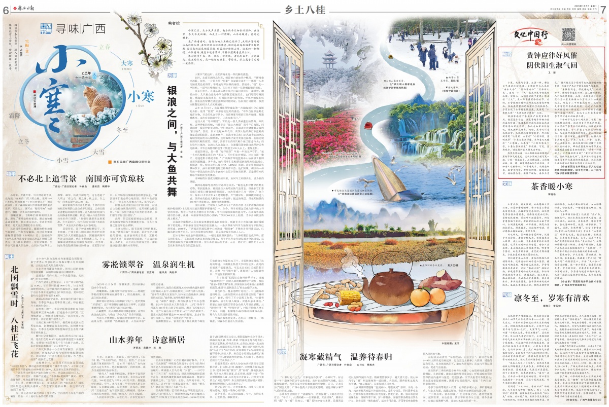 腊梅凌寒而开。范周桐 摄 二十四节气是古人对天象、气象、物候观察的结果。通过对日月星辰的观察,古人掌握了季节运行的规律;通过对风雨雷电的观察,古人掌握了气象变动的特点;而通过对动植物的观察,古人得以认识自然、提升审美、增长智慧,把握人与自然的关系。小寒、大寒、小暑、大暑,古人以最直白、最浅显的词汇读懂了自然对人类的启示,哪怕在最寒冷的季节里也能看到最温暖最美好的希望。“寻常一样窗前月,才有梅花便不同”“黄钟应律好风催,阴伏阳生淑气回”,是中国人豁达乐观的生活美学与浪漫情怀的表达,也是农耕民族独有的世界观与思维方式的表现。 2026年1月5日广西日报“二十四节气·寻味广西|小寒”版截图