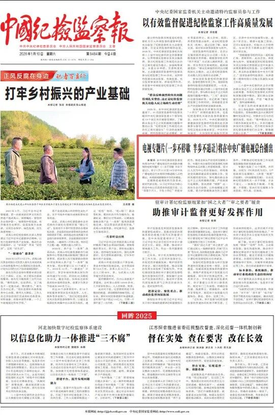 据《中国纪检监察报》1月10日消息,由中央纪委国家监委宣传部与中央广播电视总台央视联合摄制的电视专题片《一步不停歇 半步不退让》,将于1月11日至14日在中央广播电视总台央视综合频道晚八点档播出,央视新闻新媒体平台同步播发。 反腐败是最彻底的自我革命。新时代新征程,以习近平同志为核心的党中央以自我革命的高度自觉,以“得罪千百人、不负十四亿”的使命担当,推进全面从严治党和反腐败斗争。专题片充分展现纪检监察机关始终保持永远在路上的坚韧执着,坚守以人民为中心的价值取向,持续推进党风廉政建设和反腐败斗争,坚持风腐同查同治,深化整治群众身边不正之风和腐败问题,严惩政商勾连腐败,坚决清除“围猎”这一政治生态污染源,以科技赋能正风反腐,着力铲除腐败滋生的土壤和条件,不断推动纪检监察工作高质量发展取得新进展新成效。 专题片选取了12个案例,共四集,分别为《纠风治乱为民》、《严惩政商勾连腐败》、《清理“围猎”污染源》、《科技赋能反腐》,生动反映纪检监察机关一步不停歇、半步不退让,一体推进不敢腐、不能腐、不想腐,坚决打好反腐败斗争攻坚战、持久战、总体战。