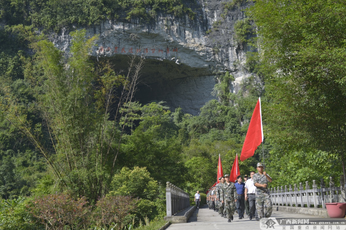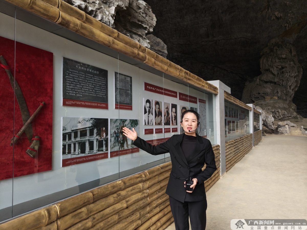 讲解员覃丽红介绍广西农民运动讲习所当年办学情况。 “农讲所先后举办了三届,培养了近600名学员。”覃丽红担任8年讲解员,对那段历史了然于胸:“这些桌凳均是按原样复制的。当年,学员们不仅要学习革命理论,还需进行军事训练,习武操练。教材多是韦拔群、陈伯民从广州带回,课程涵盖各国革命史、政治经济学概要、军事知识等。韦拔群还结合实际,创作了《劳动歌》《工农兵联合歌》《打倒列强歌》等革命山歌,以群众喜闻乐见的形式传播革命思想。” 这些学员后来像种子般撒向右江革命根据地,成为百色起义和根据地建设的中坚力量。参加过百色起义的红七军二十一师政委陈洪涛、政治部主任陆浩仁、参谋长黄大权等,以及后来的开国中将韦杰、覃健等,曾是农讲所的教员或者学员。 跨越一个世纪,这座曾在岩洞中传播真理的红色学堂,精神光芒始终照耀时代,成为参观革命旧址、接受革命传统教育的重要场所。1978年1月,时任中共中央副主席、元帅叶剑英的亲笔题词“广西农民运动讲习所旧址”,经放大后镌刻于洞口上方。1995年,列宁岩被列为自治区爱国主义教育基地;2006年,被国务院核定公布为全国重点文物保护单位。 列宁岩成为红色教育基地。 东兰县文化广电体育和旅游局局长马方康介绍,10年来,到列宁岩参观学习的党员干部、学生及各界群众累计达500万人次。