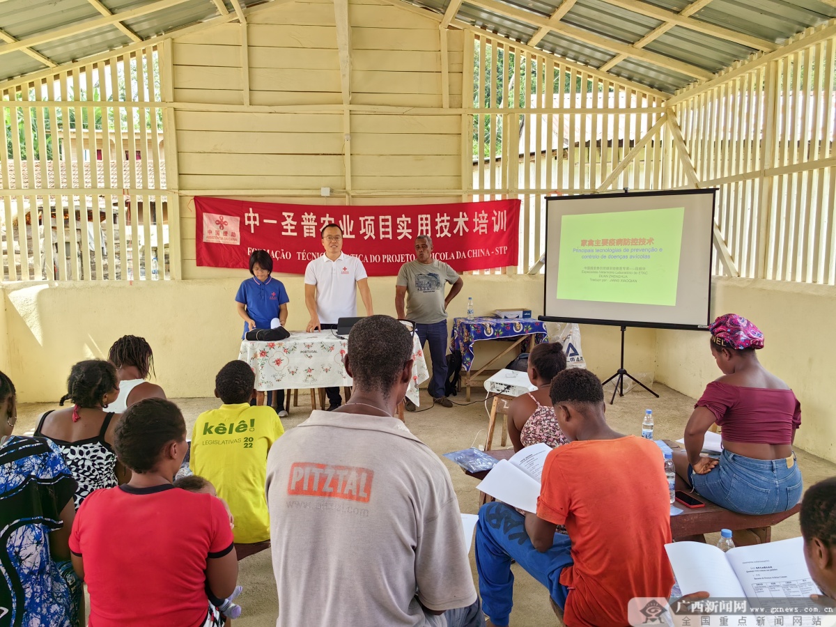 段振华向技术员和养殖户培训家禽主要疫病防控技术。 2023年8月,第六次赴非的段振华,作为援圣多美和普林西比第四期农牧业技术援助项目实验室兽医专家兼组长,面对几近停摆的国家兽医实验室,从修缮基础设施、恢复基本功能做起,逐步建立规范检测流程,并首次在全国范围内组织开展牛羊布鲁氏菌病系统监测,形成圣普首份相关流行病学资料,为国家动物疫病防控提供了重要科学支撑。