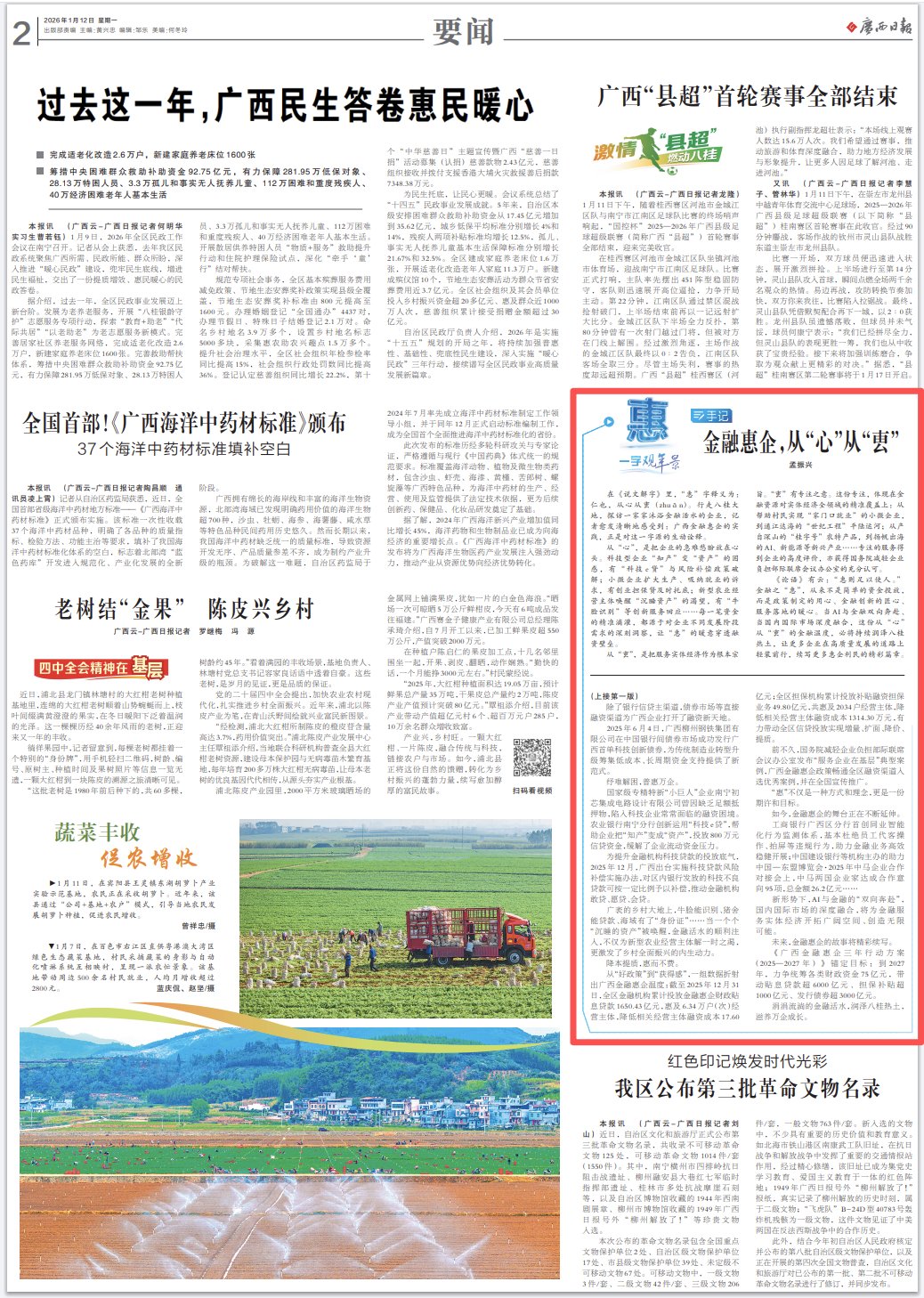 广西设立“南丹关键金属贷”特色金融产品,解决关键金属企业在技术研发、生产运营和项目拓展中的融资难题,推动产业高端化、智能化、绿色化转型。图中的南方有色金属有限责任公司得到了广西首笔“金融惠企—南丹关键金属贷”的支持。丘和 摄 落户蒙山县的广西美丽洞箱包有限公司,在县农商行300万元创业担保贷支持下迅速新增两条生产线,新招募的20多名当地员工实现了“家门口”就业。 若要评价当前金融服务,不少企业负责人都有一个共同感受——惠! “惠”从何来? 政策提气。2025年以来,适度宽松的货币政策发力显效,有力支持实体经济稳定增长和金融市场平稳运行。中国人民银行广西壮族自治区分行以结构性货币政策工具为抓手,综合运用准备金率、再贷款再贴现等多种货币政策工具支持流动性总体充裕,提高企业和个人资金可得性。 措施给力。“适度宽松”不是大水漫灌。2025年,广西引导资金更多更快流向“两新”“两重”、西部陆海新通道等重点项目建设,以及科技创新、中小微企业等重点领域。广西金融系统着力做好科技金融、绿色金融、普惠金融、养老金融、数字金融“五篇大文章”,深化金融与财政、产业政策联动效应,为经济社会发展提供更高质量、更有效率的金融服务。 金融活水如何才能精准流向最需要它的土壤?在广西,一场财政金融协同的“精准滴灌”创新实践,正在探索“最优解”。 2025年6月,在“桂惠贷”投放超过万亿元的基础上,广西积极优化金融工具,创新政策“组合拳”,出台《广西金融惠企三年行动方案(2025—2027年)》,进一步强化财政金融联动,统筹用好股权、债权、保险、担保等金融工具,畅通全区实体经济融资渠道,助力全区经济加快高质量发展。 锚定重点,通商惠工。 牵引发展的平陆运河、滋养未来的环北部湾水资源配置工程、点亮万家灯火的防城港红沙核电站……国开行广西分行作为基础设施领域的投融资主力军,在“十四五”期间累计发放基础设施贷款超3600亿元,助推广西重大项目加快建设,为地方经济社会发展蓄积强大势能。 2025年11月,广西北部湾银行与河池市政府签署合作协议,未来五年内计划投放各类信贷资产总额不少于350亿元,加快推进南丹关键金属高质量发展综合试验区建设。 除了银行信贷主渠道,债券市场等直接融资渠道为广西企业打开了融资新天地。 2025年6月4日,广西柳州钢铁集团有限公司在中国银行间债券市场成功发行广西首单科技创新债券,为传统制造业转型升级筹集低成本、长周期资金支持提供了新范式。 纾难解困,普惠万企。 国家级专精特新“小巨人”企业南宁初芯集成电路设计有限公司曾因缺乏足额抵押物,陷入科技企业常常面临的融资困境。农业银行南宁分行创新运用“科技e贷”,帮助企业把“知产”变成“资产”,投放800万元信贷资金,缓解了企业流动资金压力。 为提升金融机构科技贷款的投放底气,2025年12月,广西出台实施科技贷款风险补偿实施办法,对区内银行发放的科技不良贷款可按一定比例予以补偿,推动金融机构敢贷、愿贷、会贷。 广袤的乡村大地上,牛脸能识别、猪舍能贷款、海域有了“身份证”……当一个个 “沉睡的资产”被唤醒,金融活水的顺利注入,不仅为新型农业经营主体解一时之渴,更激发了乡村全面振兴的内生动力。 降本提质,惠而不费。 从“好政策”到“获得感”,一组数据折射出广西金融惠企温度:截至2025年12月31日,全区金融机构累计投放金融惠企财政贴息贷款1650.43亿元,惠及6.34万户(次)经营主体,降低相关经营主体融资成本17.60亿元;全区担保机构累计投放补贴融资担保业务49.80亿元,共惠及2034户经营主体,降低相关经营主体融资成本1314.30万元,有力带动全区信贷投放实现增量、扩面、降价、提质。 前不久,国务院减轻企业负担部际联席会议办公室发布“服务企业在基层”典型案例,广西金融惠企政策畅通全区融资渠道入选优秀案例,并在全国宣传推广。 “惠”不仅是一种方式和理念,更是一份期许和目标。 如今,金融惠企的舞台正在不断延伸。 工商银行广西区分行首创同业智能化行为监测体系,基本杜绝员工代客操作、拍屏等违规行为,助力金融业务高效稳健开展;中国建设银行等机构主办的助力中国—东盟博览会·2025年中马企业合作对接会上,中马两国企业家达成合作意向95项,总金额26.2亿元…… 新形势下,AI与金融的“双向奔赴”,国内国际市场的深度融合,将为金融服务实体经济开拓广阔空间、创造无限可能。 未来,金融惠企的故事将精彩续写。 《广西金融惠企三年行动方案(2025—2027年)》锚定目标:到2027年,力争统筹各类财政资金75亿元,带动贴息贷款超6000亿元、担保补贴超1000亿元、发行债券超3000亿元。 涓涓流淌的金融活水,润泽八桂热土,滋养万企成长。 手记 金融惠企,从“心”从“叀” 孟振兴 在《说文解字》里,“惠”字释义为:仁也,从心从叀(zhuān)。行走八桂大地,探访一家家沐浴金融活水的企业,记者愈发清晰地感受到:广西金融惠企的实践,正是对这一字源的生动诠释。 从“心”,是把企业的急难愁盼放在心头。科技型企业“知产”变“资产”的困惑,有“科技e贷”与风险补偿政策破解;小微企业扩大生产、吸纳就业的诉求,有创业担保贷及时托底;新型农业经营主体唤醒“沉睡资产”的渴望,有“牛脸识