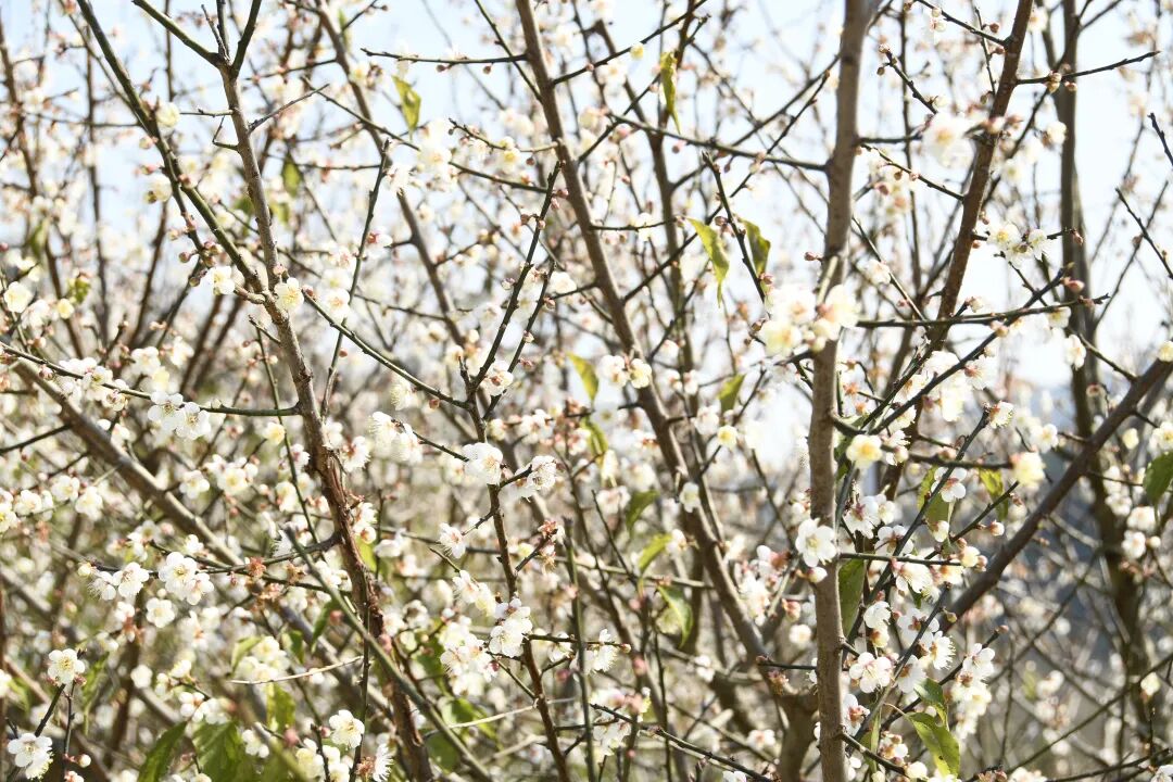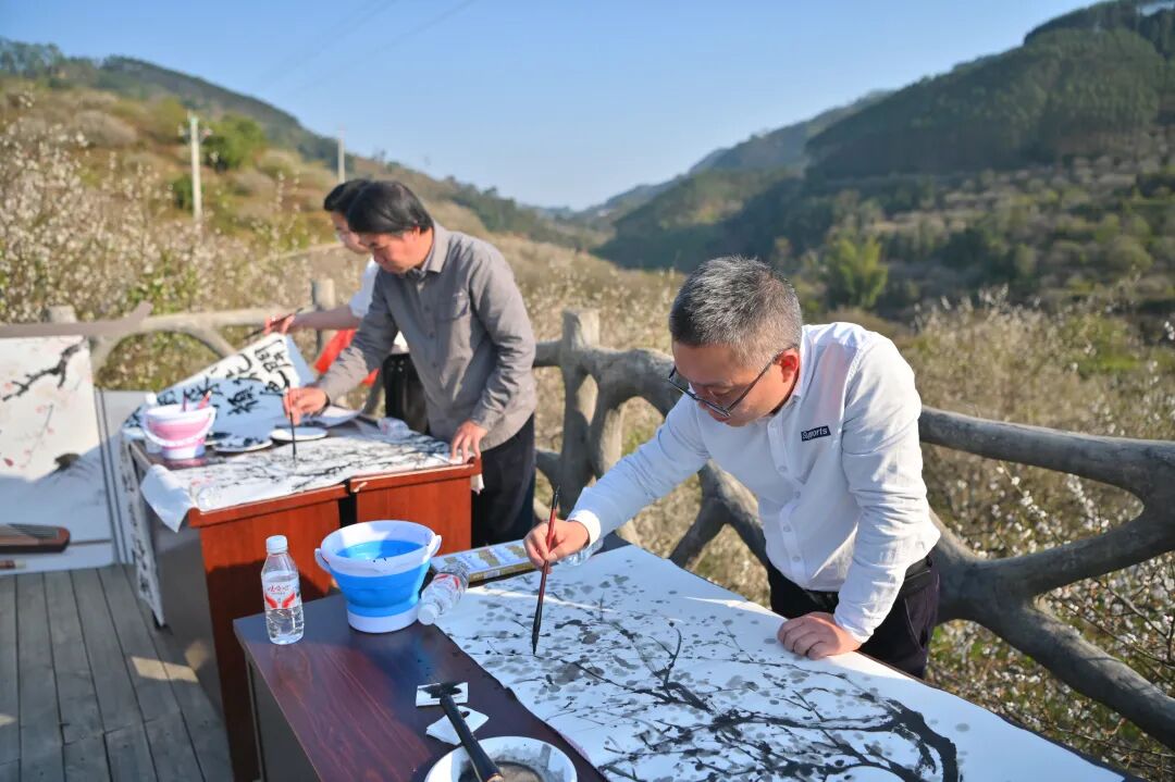 游客在观赏青梅花。 还能亲身体验琴笛合鸣、 墨香伴梅影的诗意雅集, 看到书画爱好者即兴挥毫!