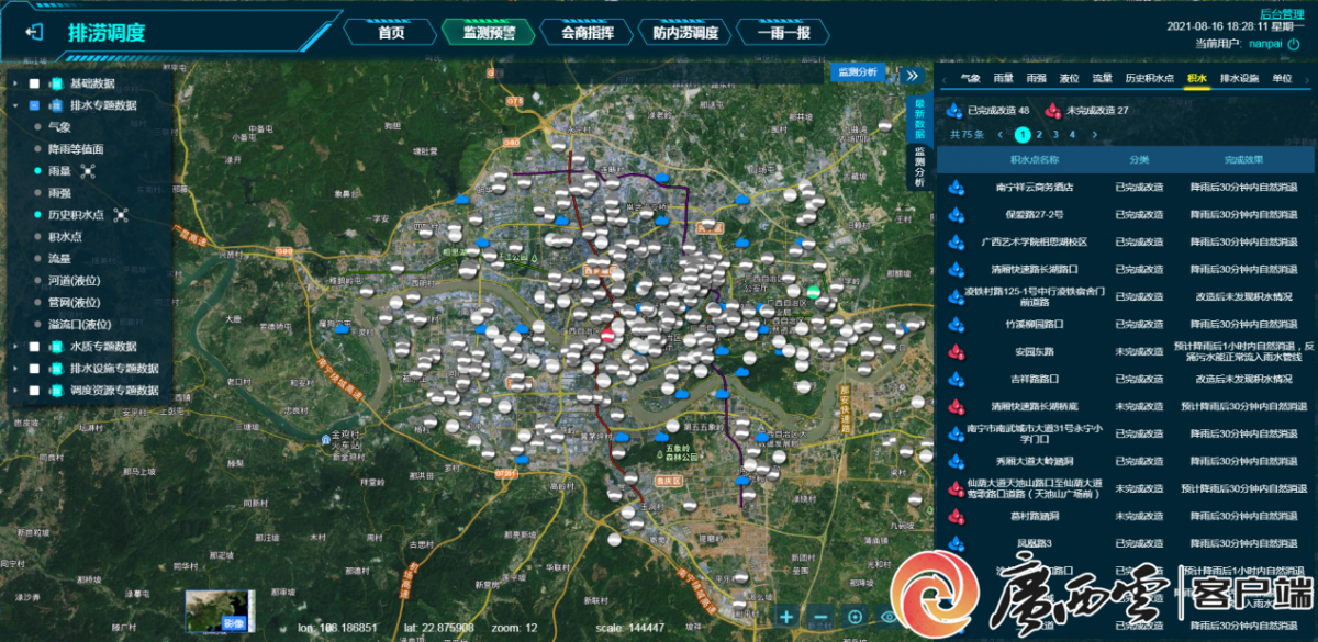 修缮后的中山路街区焕然一新。 如今,中山路与水街历史文化街区项目,已同步升级市政基础设施:路面翻新,雨污分流,水电气网管线全面换新。同时,功能活化与民生改善也更为凸显:夜市摊点统一规划,保留美食业态的同时升级配套设施;建筑内部布设消防管道,满足现代生产生活需求。 不远处,水街上的“黄阿婆玉兰粉虫店”也迎来新生。“以前在老街支摊,地方小、来客也有限。”作为南宁粉虫制作技艺的第四代传承人,周丽娜见证了店铺从街角到铺面的变迁。“现在搬进新铺面,新装的排烟系统让厨房不再呛人,食客也比从前多了。”阳光透过雕花窗棂,为粉虫镀上一层温暖的光晕,让百年老街的烟火气愈发鲜活。 一座城的历史文脉是其建设发展的根和魂。“‘十五五’期间,南宁市将持续建设文明城市,坚持以文化人、以文惠民、以文润城、以文兴业,全力创建国家历史文化名城。”宁世朝表示。 精细治理打造韧性城市 在南宁市住房和城乡建设局排水防涝指挥调度中心,记者见到了包含网络大屏指挥系统和App终端的南宁市排水防涝智慧平台。轻点鼠标进入调度模块,全市52个雨量站点、39个防内涝专业队伍实时雨量计的数据一目了然,降雨期间每分钟更新一次,实现精准掌握市区各区域的降雨情况。
