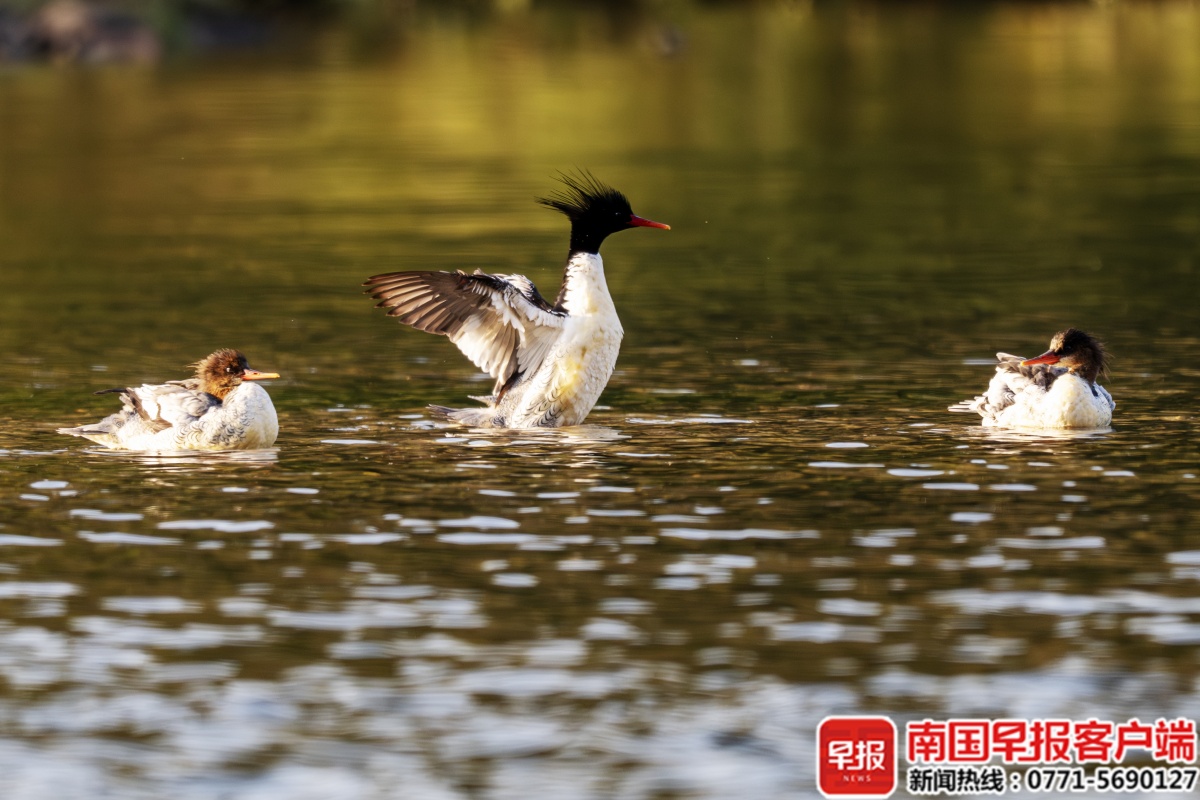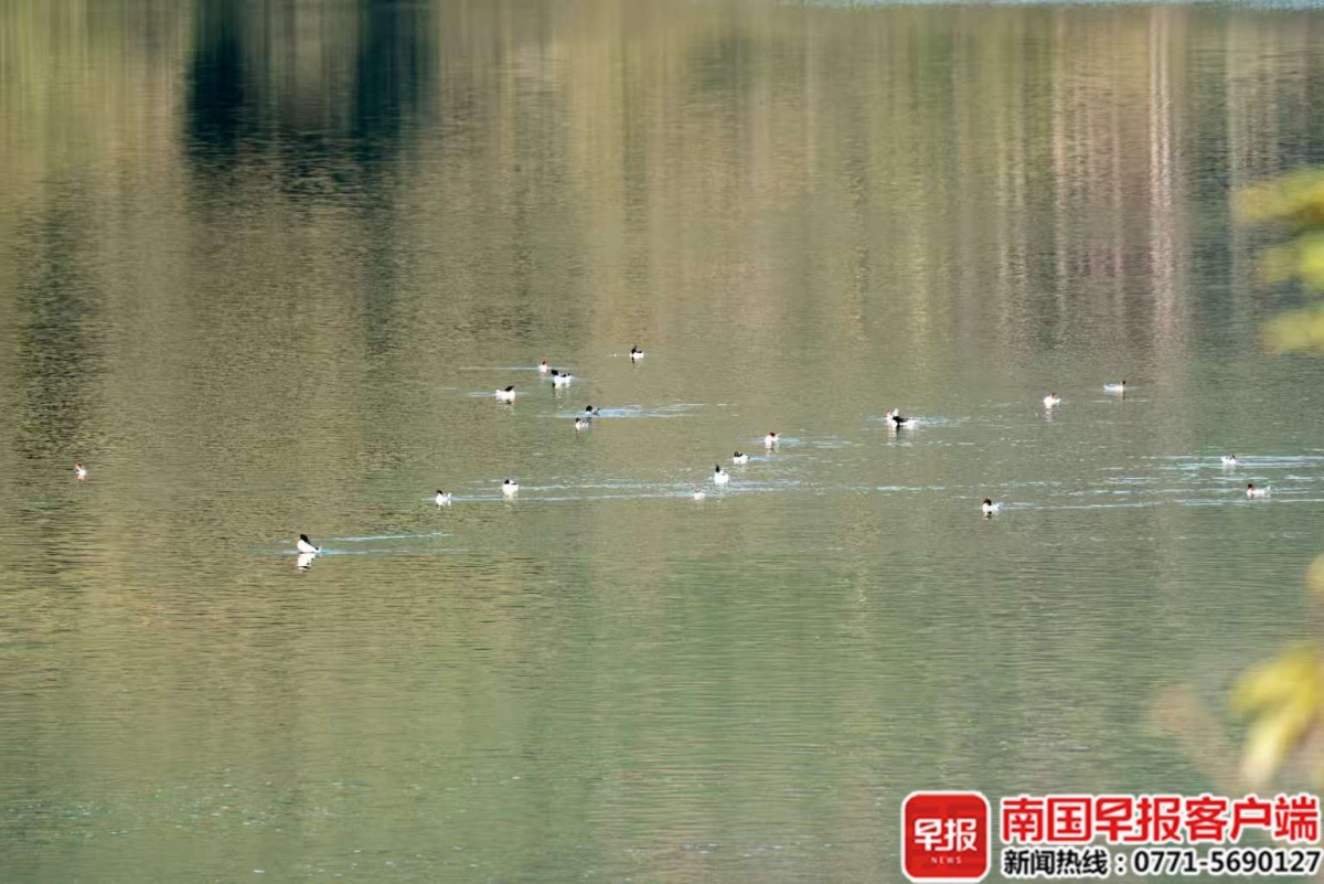 越冬的秋沙鸭群。 近年来,广西持续加强重点流域生态保护与修复,洛清江以洁净的水质、丰茂的水草、丰富的鱼类资源以及受控的人为干扰,成为中华秋沙鸭稳定可靠的“五星级驿站”。 本文由南国早报原创出品,未经许可,任何渠道、平台请勿转载。违者必究。 |