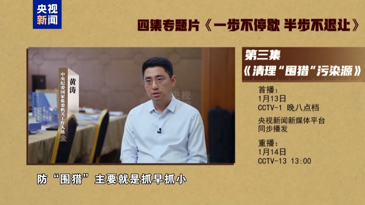 习近平总书记深刻指出,行贿人“围猎”是政治生态的一个重要“污染源”,要坚决防范各种利益集团“围猎”和“绑架”领导干部,坚决铲除腐败滋生的土壤和条件。如果不清除“围猎”这一污染源,腐败将会陷入查不胜查的境地。 电视专题片《一步不停歇 半步不退让》第三集《清理“围猎”污染源》,讲述纪检监察机关坚决贯彻落实党中央决策部署,针对“围猎”乱象强化全链条惩治,从源头着力、向治本深化,多措并举,破除“围猎”与甘于被“围猎”的利益链,推动实现腐败问题的标本兼治。总台央视综合频道1月13日晚8点档播出,央视新闻新媒体平台同步播发。 腐败和权力往往相伴而生,一些人为了借助权力牟取不当利益,挖空心思、无孔不入,不仅拉拢腐蚀领导干部本人,还把网撒向他们的家人。