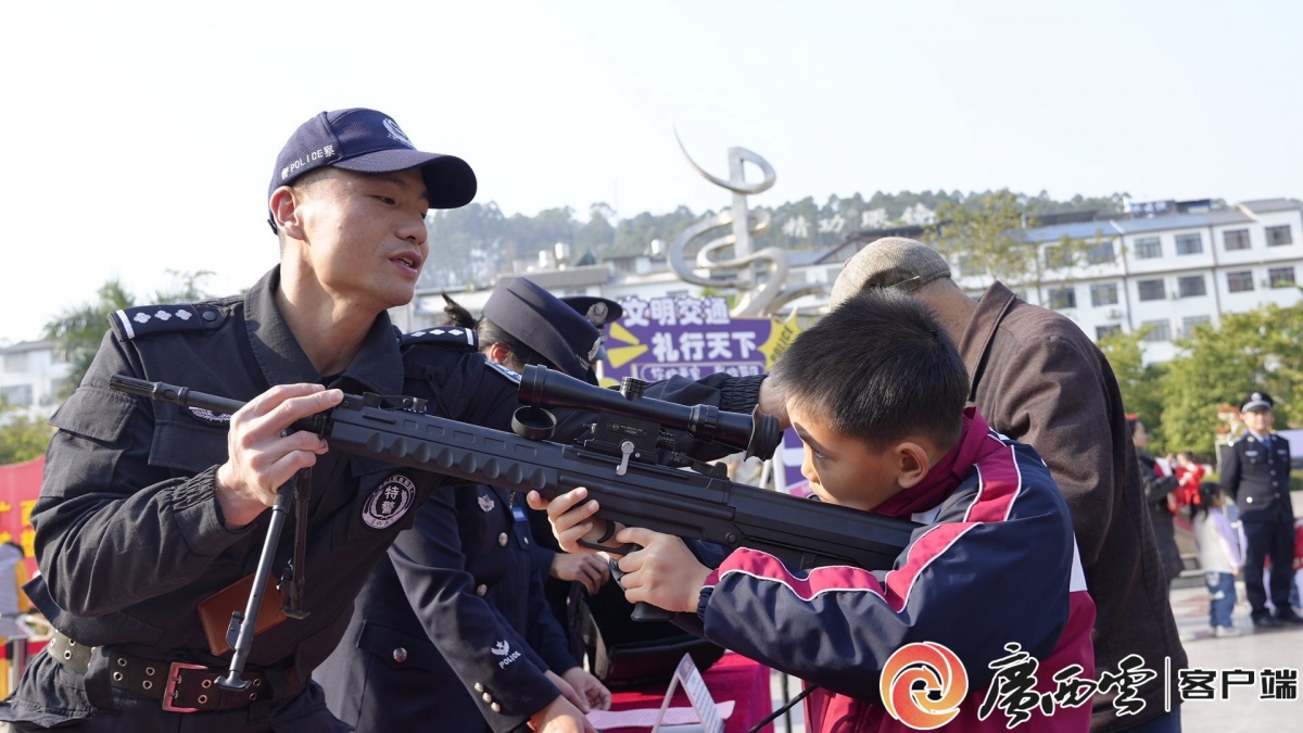 特警教小朋友学习拿枪。 在人民警察节暨“110宣传日”之际,1月10日上午,巴马瑶族自治县寿乡文化广场上人头攒动。一场以“公安心向党 护航新征程”为主题的公安宣传活动在这里展开。 广场一侧,普法展板整齐排列,吸引不少群众驻足细看;毒品样品展示台前,民警向围拢的居民讲解新型毒品的隐蔽性与危害;装备展示区内,特警队员演示着警用器械,引来阵阵惊叹。现场气氛活跃,民警们结合真实案例,耐心讲解电信诈骗的常见套路、禁毒法律法规以及道路交通安全知识。