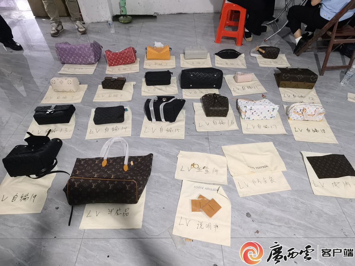 现场查获假“LV”包。八步区市场监督管理局供图 2025年10月10日,根据群众举报线索,八步区市场监督管理局联合公安机关,对位于八步区贺街镇的一处私人房屋进行突击检查。执法人员进入现场后发现,该民房二楼内隐藏着一个规模化的皮包加工窝点,面积近600平方米,现场机器轰鸣,多名工人正在生产带有显著“LV”标识的皮包,室内弥漫着浓烈的皮革与胶水气味。 经现场清点,共查获标有“LOUIS VUITTON”注册商标的侵权成品皮包982个,涉及20个不同款式,同时查获半成品包243个、侵权五金配件15000个、侵权布料11卷、侵权皮料1230片及侵权防尘袋470个。涉案物品上使用的商标标识与路易威登马利蒂(法国)公司注册的商标完全相同。执法部门随即联系商标权利人授权的鉴定机构到场进行专业鉴别,确认上述物品均涉嫌侵犯注册商标专用权,并依法对全部涉案物品实施了扣押。