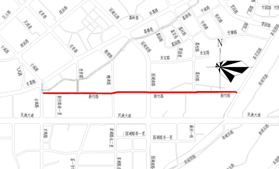 古城路(建政路—民主路)施工点位图。(南宁交警供图) 1月13日至6月30日,对新竹路(古城路—茶花园路)南侧机动车道和非机动车道进行围挡施工,保留北侧机动车道和非机动车道。施工期间,新竹路(古城路—茶花园路)实施机动车单向通行交通限制,即机动车仅可从新竹路(古城路—茶花园路)保留的北侧机动车道转出往南北东3个方向通行,禁止从其他方向转入。非机动车不受影响正常通行。新竹路(古城路—茶花园路)施工顺序为从西向东推进,每段围挡长度为150米。相关车辆可绕行民族大道、古城路、东葛路、茶花园路等道路。