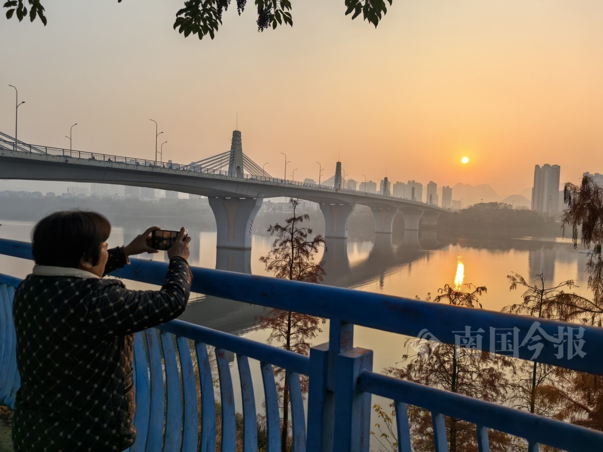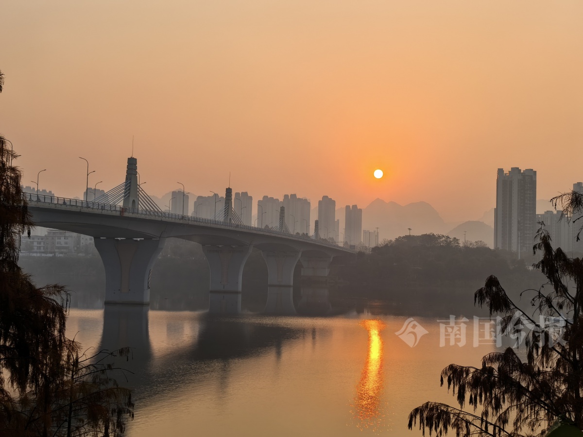 1月14日清晨 柳州静兰大桥畔 江面的薄雾尚未散尽 旭日缓缓东升
