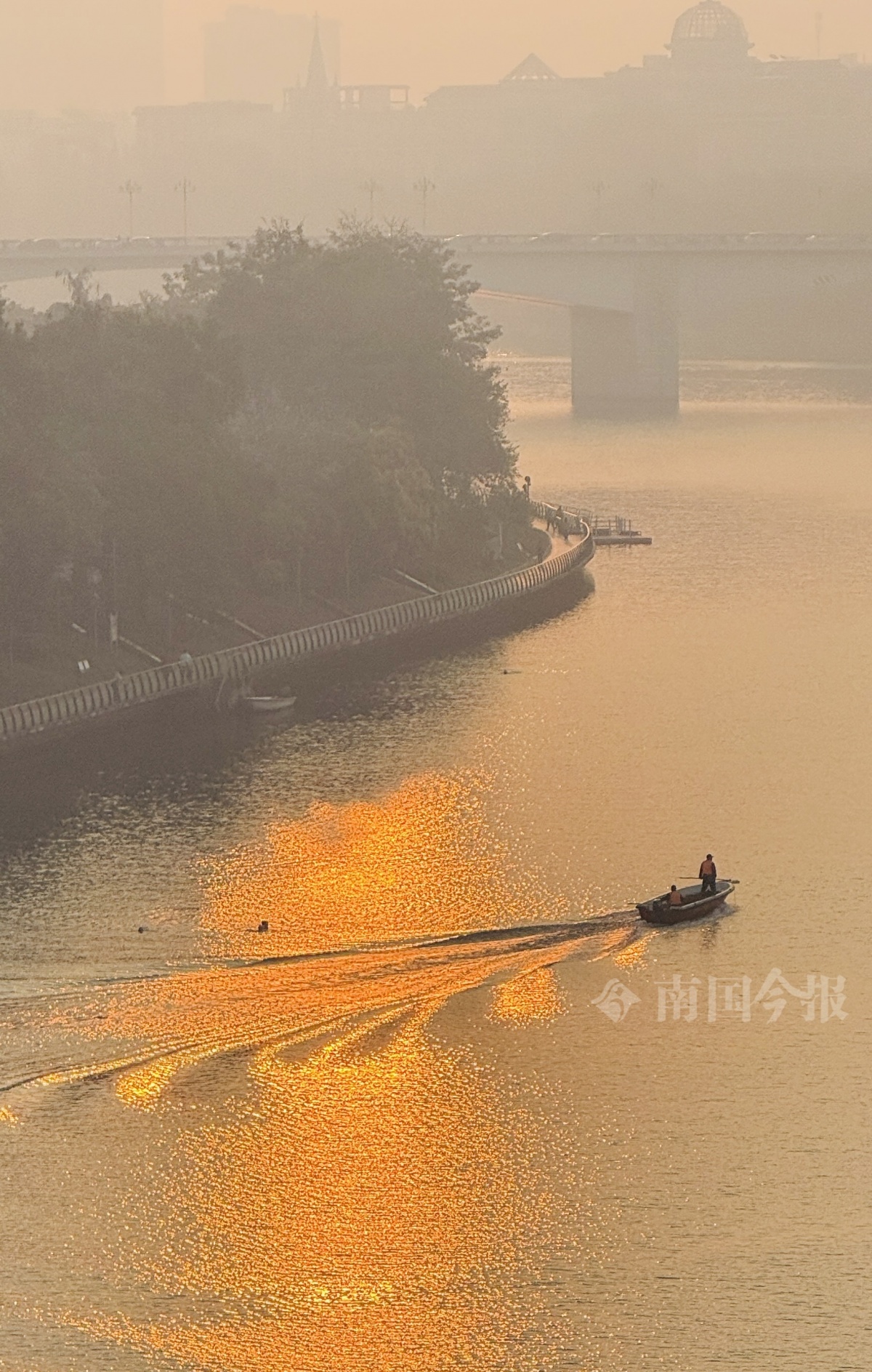 今报记者颜篁 摄 薄雾深处 扁舟渐行渐远 不舍地与江畔的粉色异木棉告别 早起的龙城人 纷纷为今晨的薄雾日出驻足 欢愉地迎接新的一天