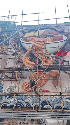 好大一碗螺蛳粉! 1月14日上午,在柳州市青云菜市,施工工人将一碗直径4.2米、高度3.3米的巨大螺蛳粉雕塑装置安装到一面墙体上。鸭脚、猪脚、螺蛳……立体具象的柳州螺蛳粉形态呈现在眼前,吸引不少游客围观拍摄。 青云菜市螺之神韵设计施工方负责人陈鸿林介绍,他们前后调整了多个方案,最终确定采用墙面做旧工艺,搭配立体具象的螺蛳粉造型,强化视觉冲击力,提升游客打卡拍照的体验感。从设计、制作到安装,整个流程耗时约3个月,整体安装工作将于这两天完成。